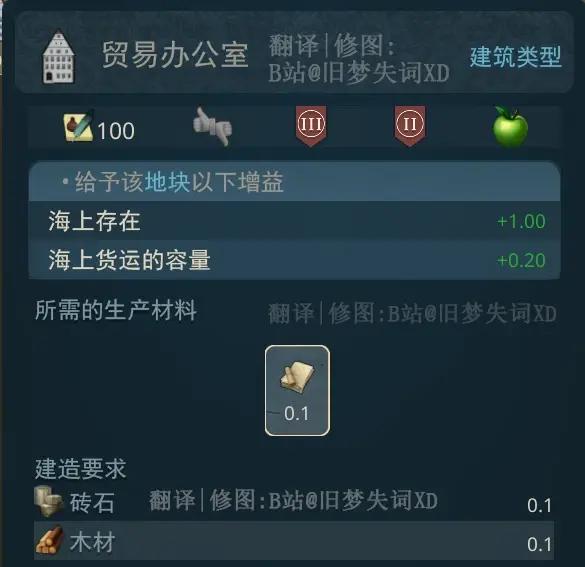 還有一些建築比較特殊,製作組把它們叫做“國外建築”,顧名思義就是能在其他國家建造的建築。這裏舉三個例子。可以在對玩家關係高於100的國家裏建造貿易辦事處,提升本國在對方市場裏的貿易規模。可以在相同等級或者更高等級的國家的首都建造大使館,擴大外交容量並且移除這裏的戰爭迷霧,不過需要投入大量紙張和珠寶來維持大使館的運轉。