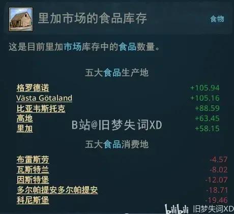再說一個不能用拉條調整的開支:食物花費。食物在EU5裏可以視作一種特殊的商品,每個地點上的食物產量主要由當地農民和奴隸人口數決定,並受到自然條件、社會價值、政府改革、階層滿意度等多種因素影響。如果一個省的整體食物產量跟不上消耗量,就要從國庫裏掏錢去市場上買糧食來解決當地的缺糧問題,也就是這裏的食物花費。