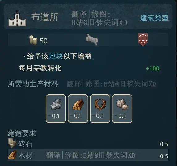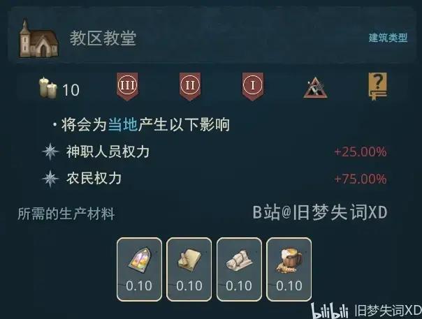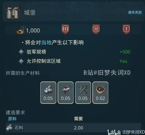 第三類是加成建築,主要是用來給當地提供加成的。比如城堡這個建築會消耗石頭工具武器焦油,但並不產出任何商品,而是增加當地駐軍規模並且在周圍開啓堡壘控制區。