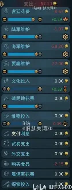 財政開支的類型就比較多了,我們主要看幾個能用滑條調控的開支。宮廷花費能提升正統度,具體花銷受到進步、法律等因素的影響。宮廷花費不夠多的話,正統度就會往下掉。陸軍維護費和海軍維護費是大家熟悉的概念了,拉低維護費會降低軍隊的戰鬥力。要塞維護費也是經典概念了,拉低要塞維護費會讓要塞更快被攻下。