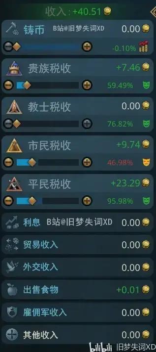 另一個常見的財政收入來源就是稅收收入了。在EU5裏,每一個地點都會根據當地發展情況確定一個稅收基礎,並且按照一定比例分配給各個階層。玩家可以用滑條調節各個階層的稅率,收的稅越多,對應階層的滿意度也會越低。稅收情況還會受到法律、階層特權以及當地控制力高低的影響。沒有被收上來的錢會留在階層手裏。