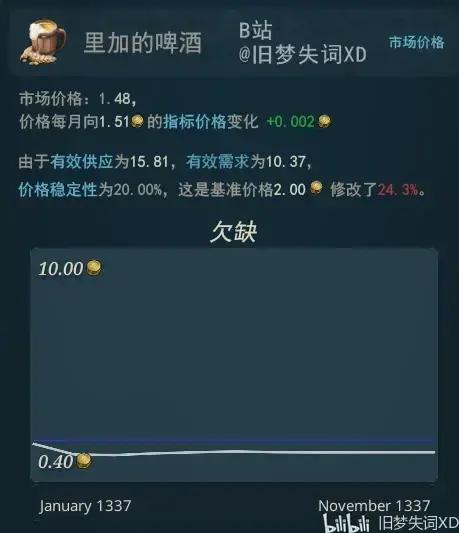 最後我們來到貿易相關的內容。商品,也就是我們之前提到的資源生產作業產出的原材料,以及生產建築產出的各種產品,在每個市場裏都有各自的價格,主要取決於市場裏的供應量和需求量。市場內的供需情況會確定一個價格的目標值,當前價格會向着這個目標值變動,變動速度受到價格穩定度的影響。價格穩定度會隨着時代發生變化。