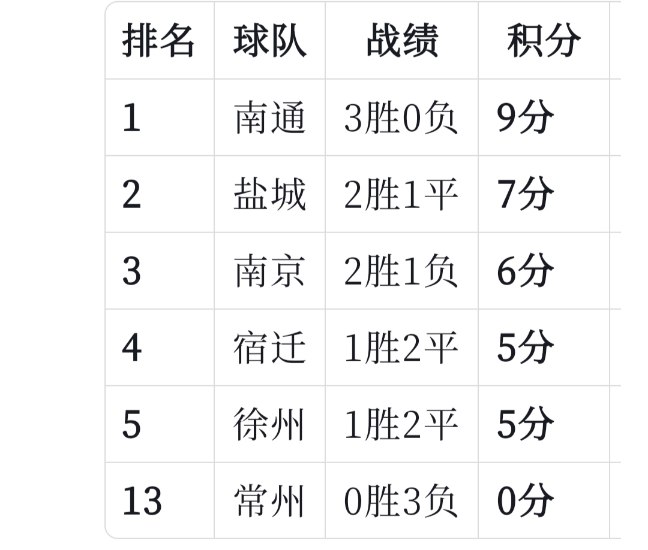 目前積分如下:南通以全勝0負領跑第一,而常州以0勝全輸穩坐倒數第一,網上調侃說常州竟然請到了“國家隊”……