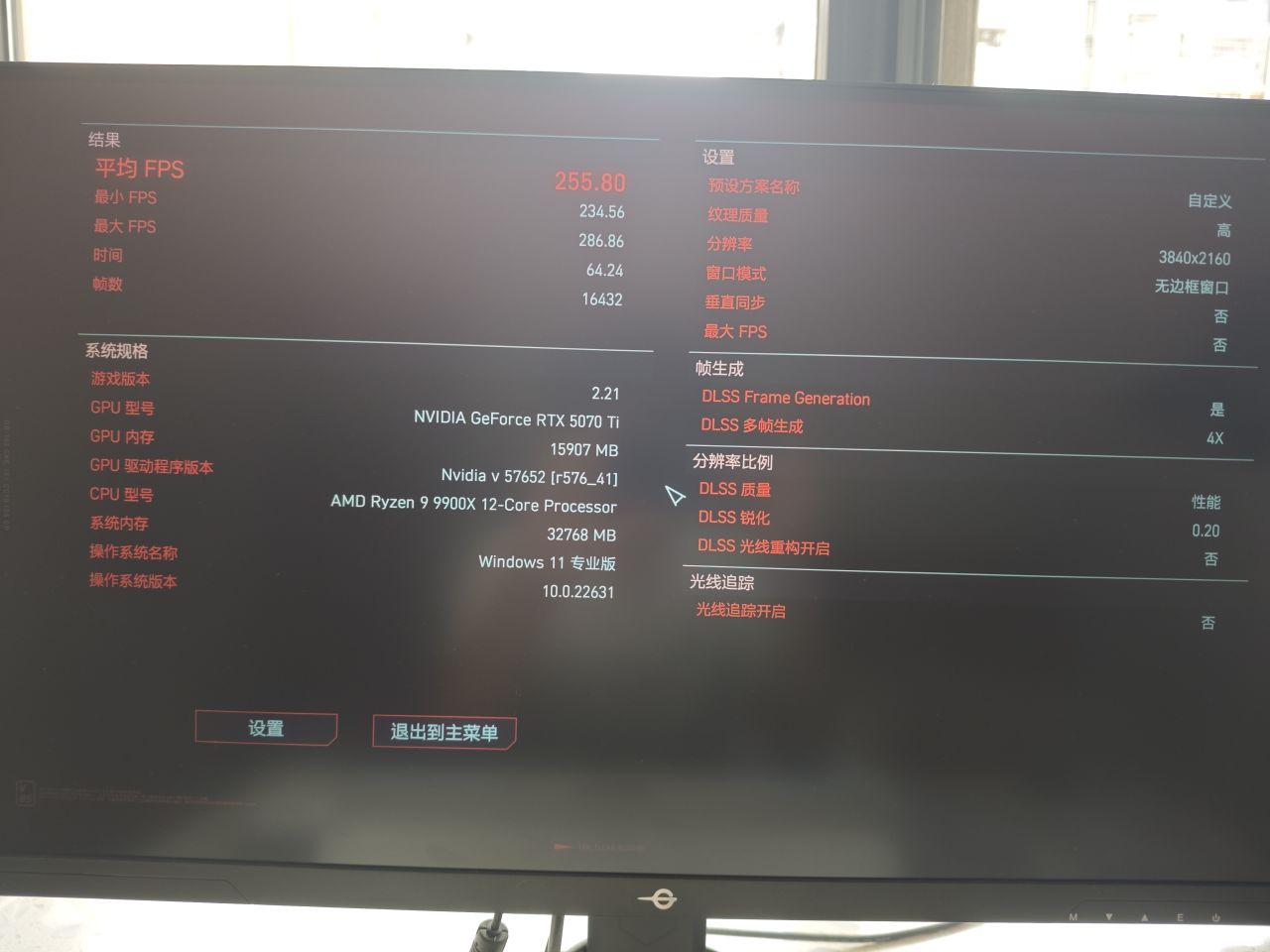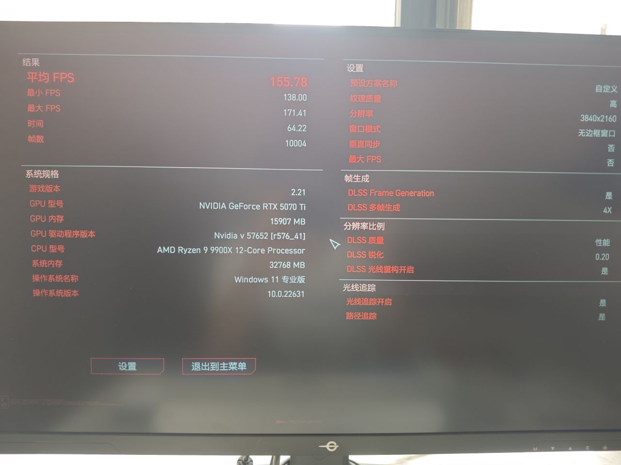 顯示器是4k的。六次測評的畫質都是4K全部拉滿,只是DLSS和光追開或關。這裏六張圖片,前四張是賽博朋克2077的,後兩張是荒野大鏢客二的。