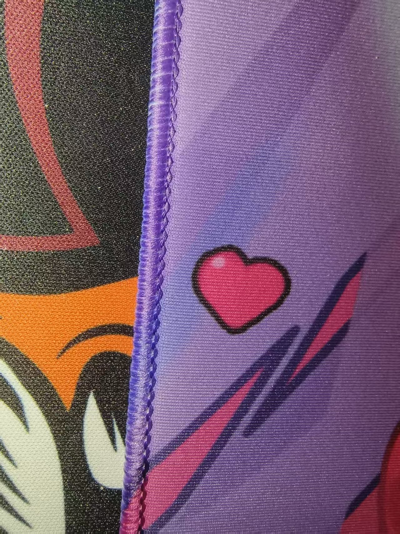 而优质鼠标垫的布料大多数都采用高密度纤维布、孟宗竹炭布等。比如这款鼠标垫就使用了双层混纺类PA面料,即聚酰胺(Polyamide,简称PA)面料,也被称为尼龙(Nylon)或锦纶,具有高强度、卓越的耐磨性、良好的弹性和弹性回复性、优良的染色性的特点,这也是目前大多数职业选手比较青睐的材质之一。耐磨性使其表面的纹路不易造成损失,极大的增加了鼠标垫的寿命;良好的弹性使其质感舒适柔软,即使用力按压也会有柔和的回弹反馈;有良的染色性使其上色时能够绘制出更为精细的图案,因此图片就显得格外高清。