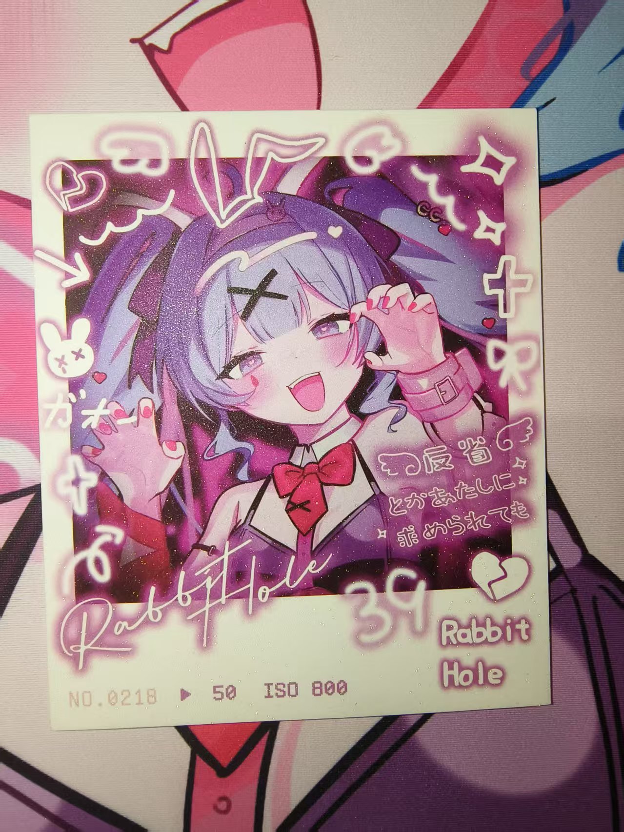 这款鼠标垫的图案的主体是一位身穿兔女郎服饰的可爱二次元少女形象,其灵感来源于歌曲《兔子洞》,整体配色以粉、蓝、黑为主,周围点缀着扑克牌、霓虹等充满舞台效果的图案,再搭配上可爱的吓唬人动作以及线条分明、画质高清的图案,整个可爱又极具魅惑性的洞洞兔形象在此刻栩栩如生。
