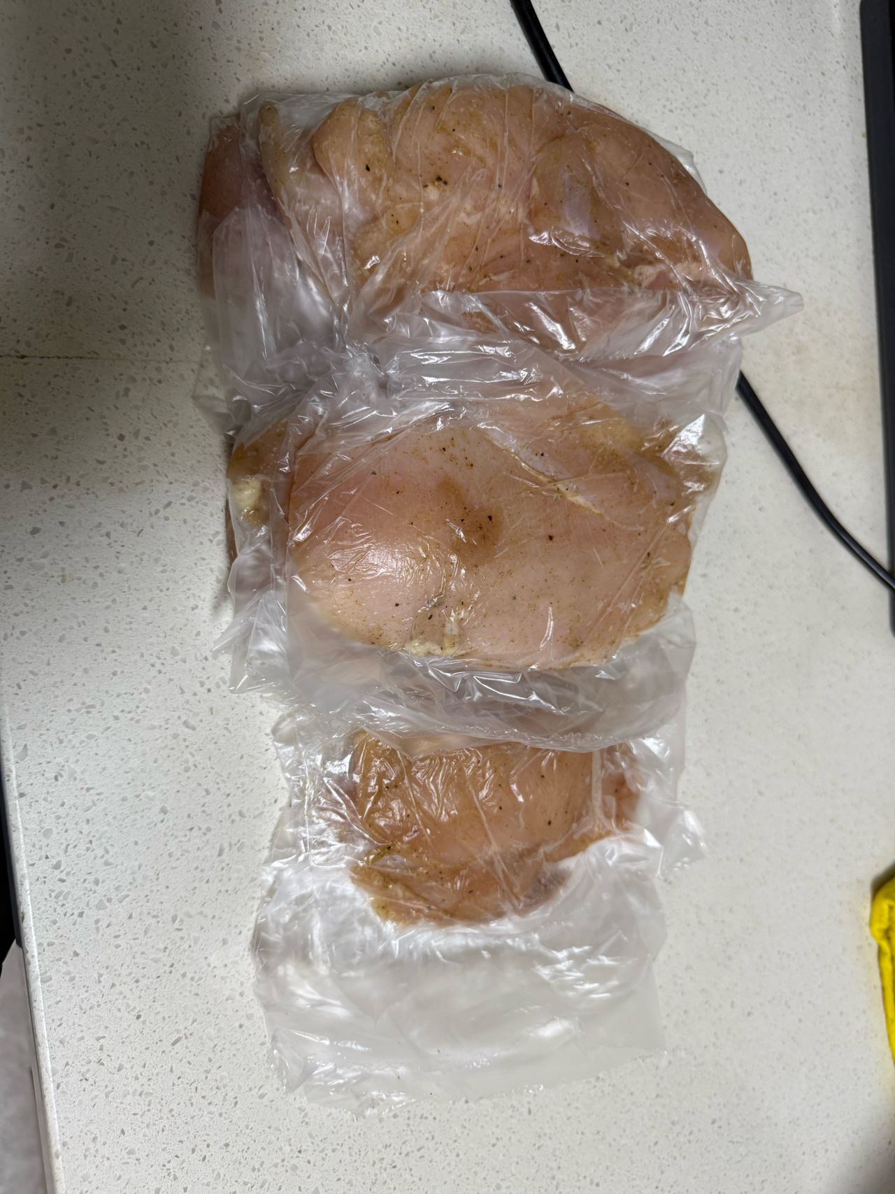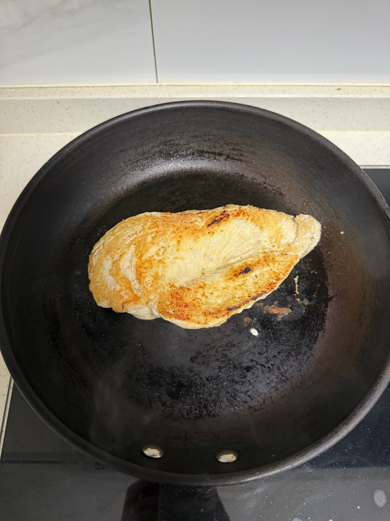 前一天晚上放入冰箱冷藏解冻,平底锅烧热,喷5-7下油即可,油热后放入鸡胸肉,小火煎熟,如有工具可以在两面煎至变色后剪成小块,熟的更快。