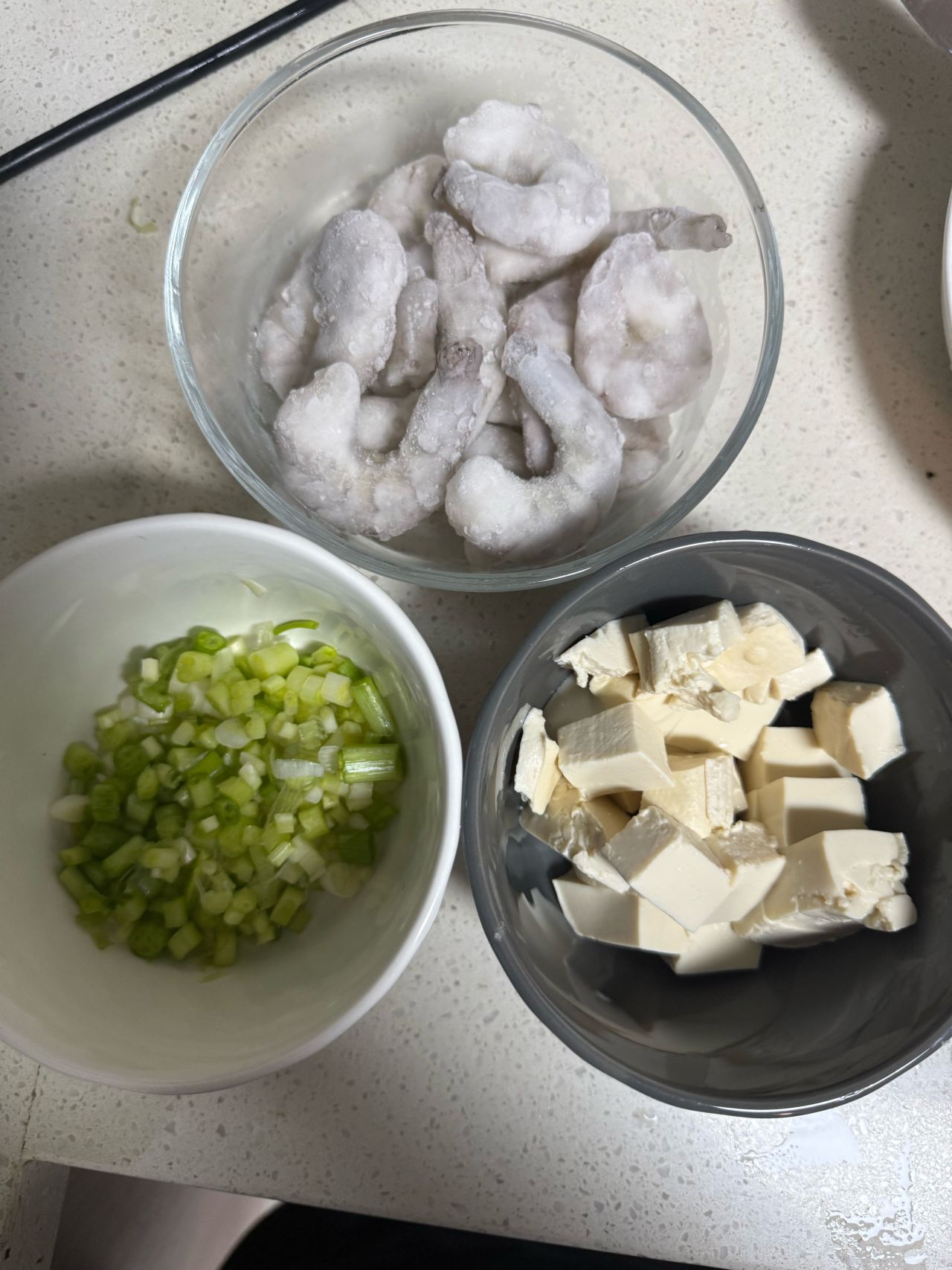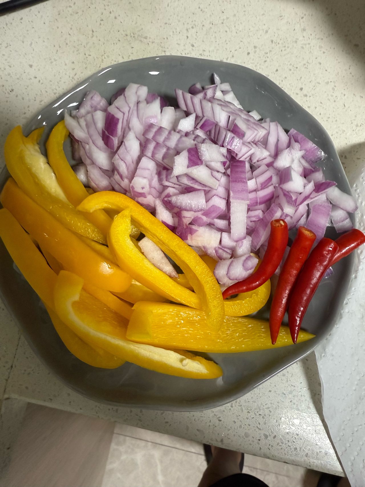 烧一壶水,切配料如下图(辣椒什么样的都行、大葱小葱换洋葱也行,都无所谓)