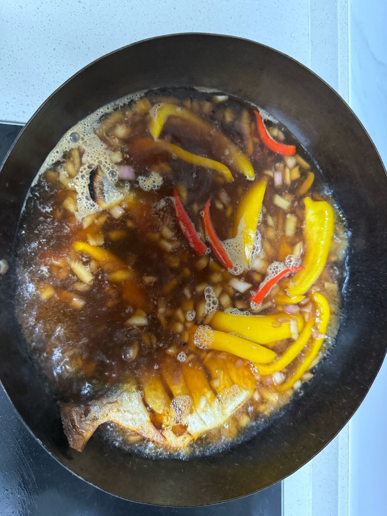 放入辣椒继续炒半分钟,放盐、花椒粉、糖、倒开水,能没过鱼即可。