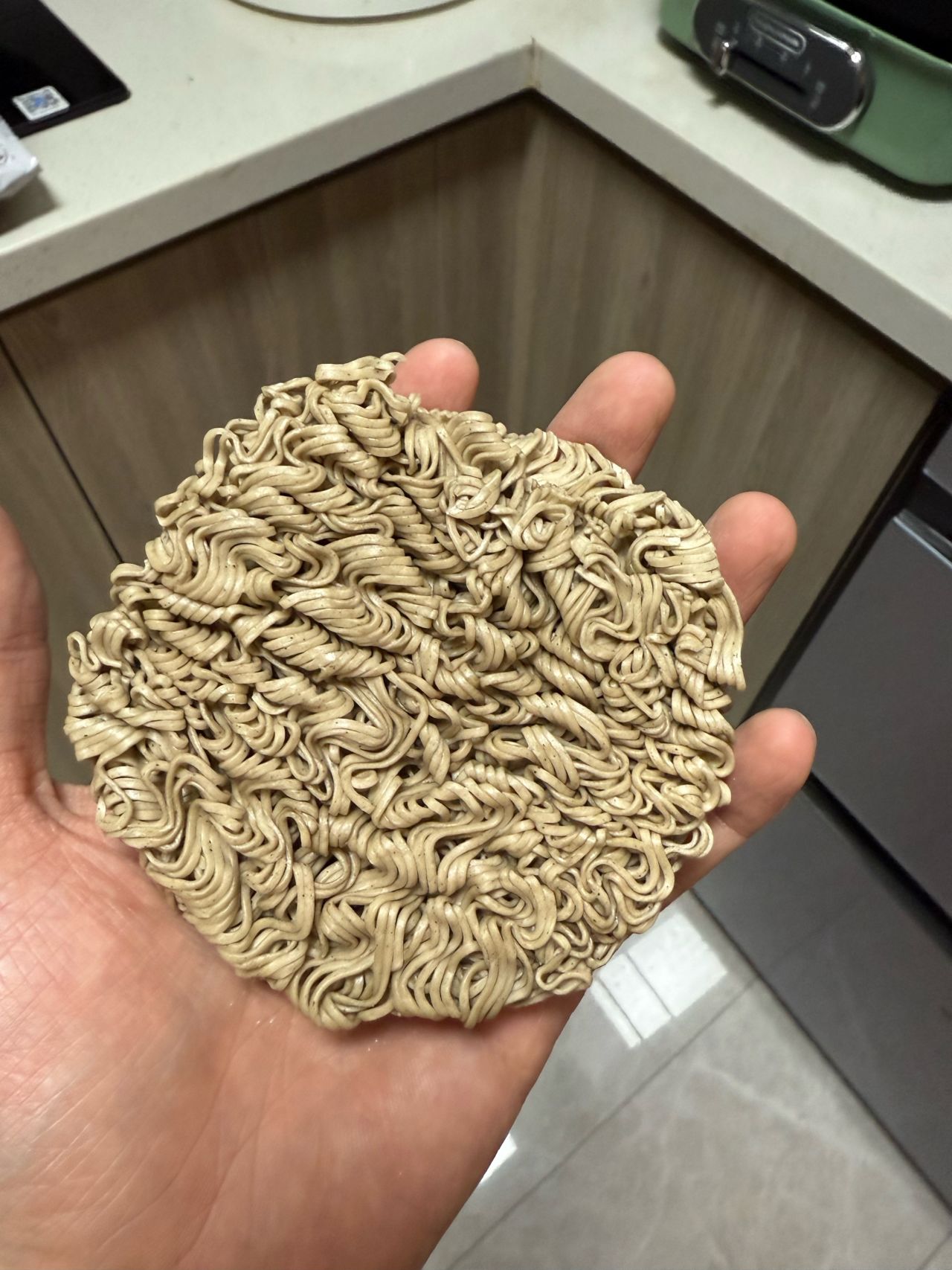 配料表干净,但是没有料包,纯面饼,我一般午餐或者晚餐会回家吃,面直接泡就行,搭配自己购买的蔬菜包和辣椒酱,如下图。