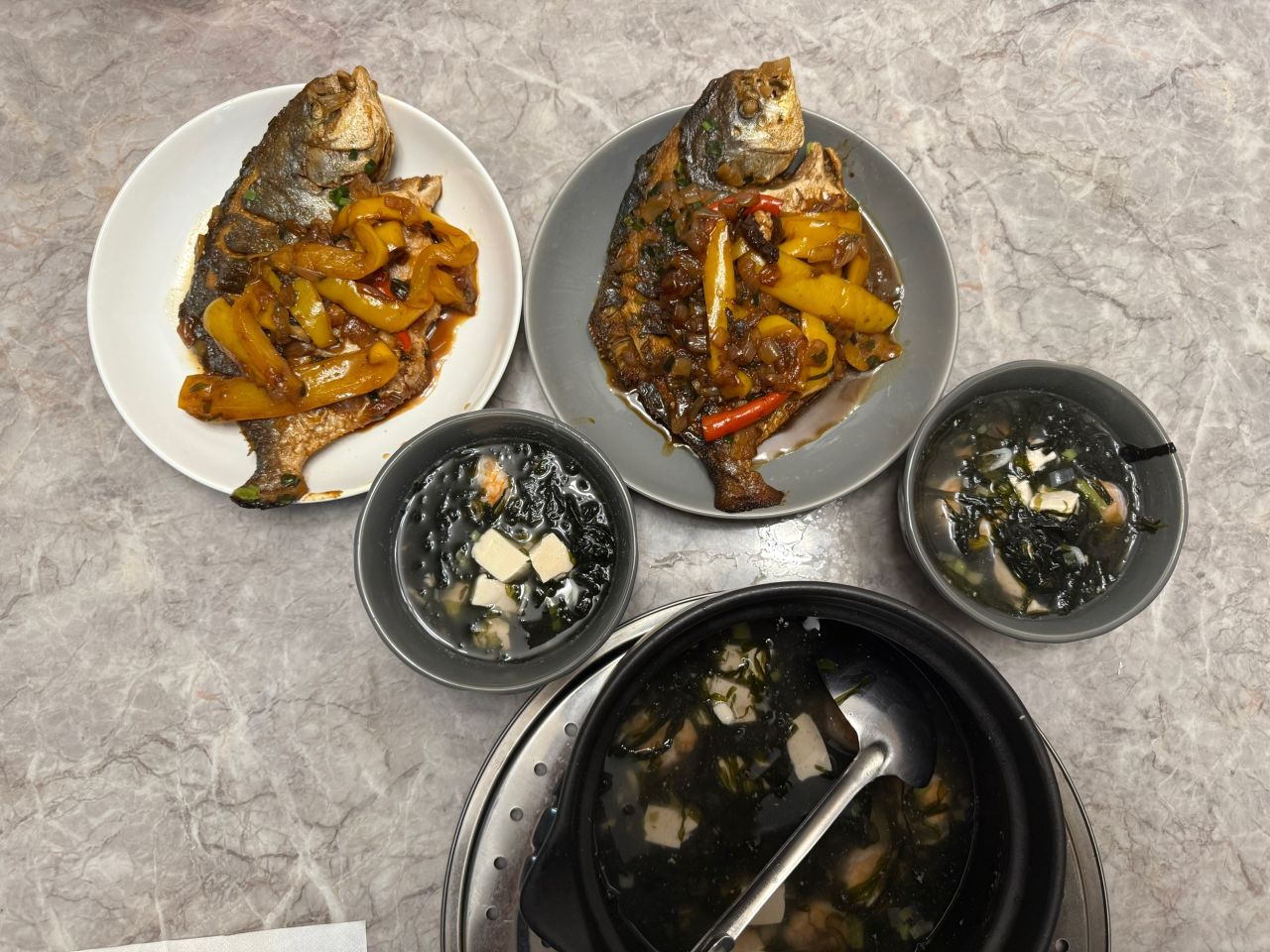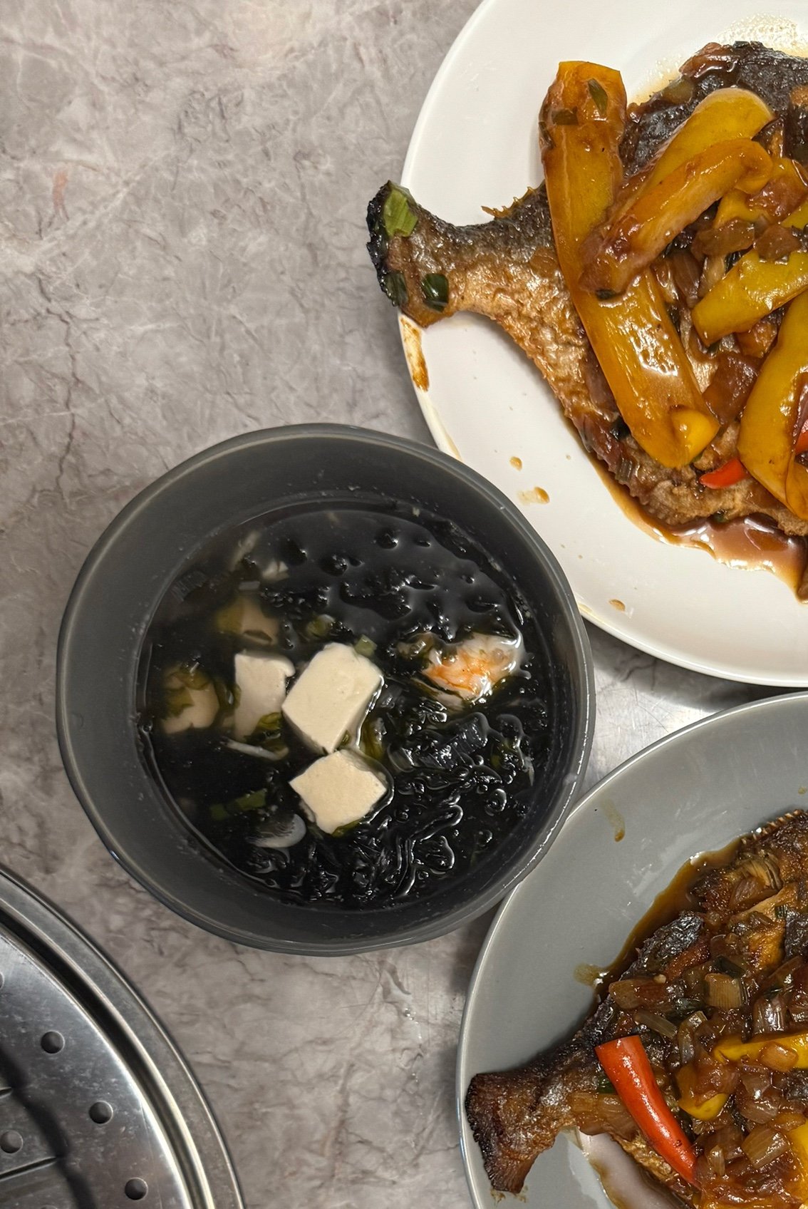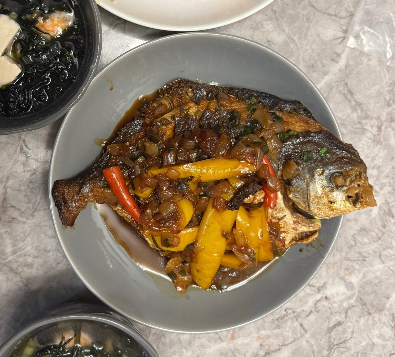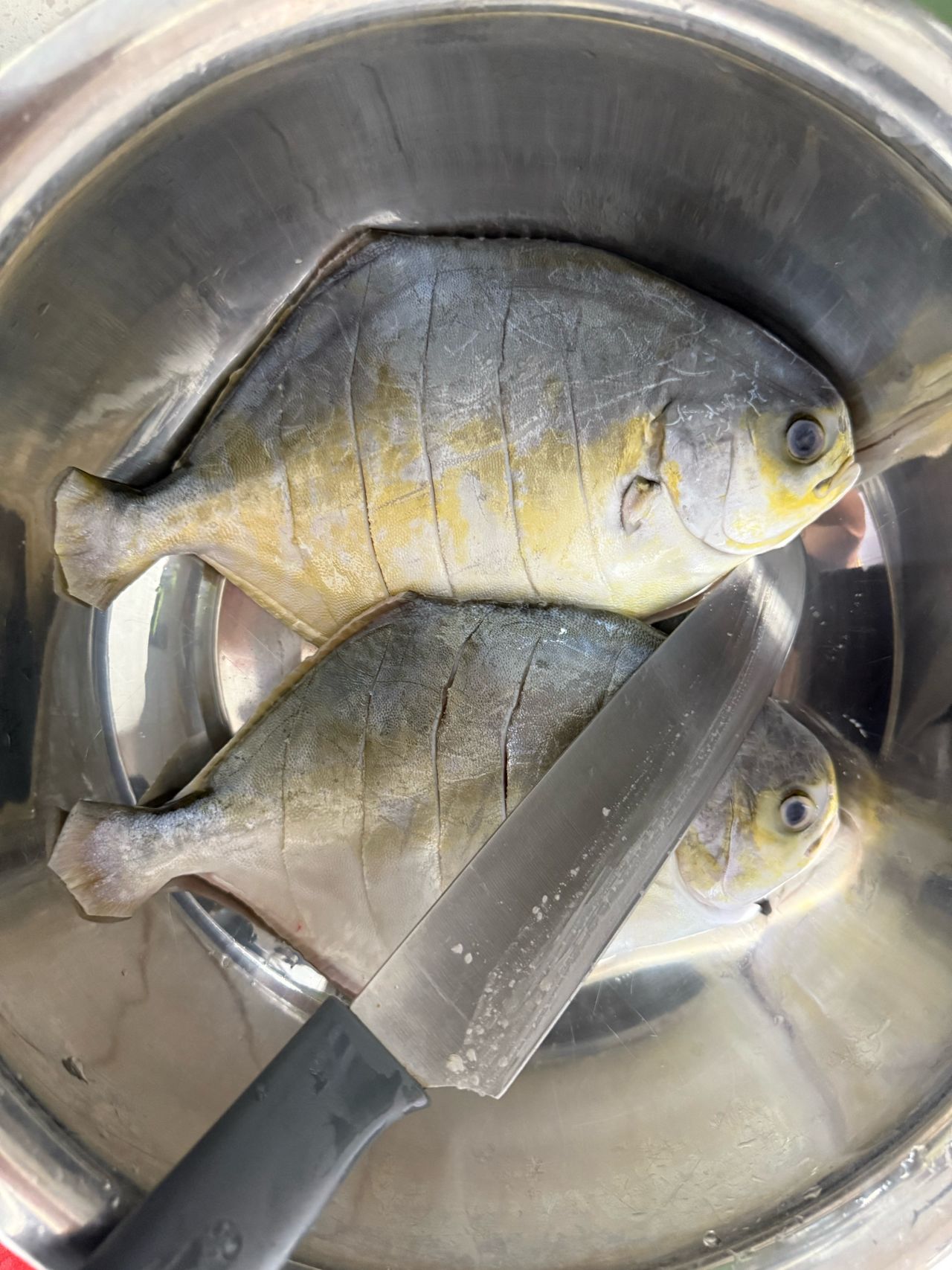 鱼解冻洗净,两面各划几刀,锅热多倒点油,如果平时吃橄榄油,这时倒别的油,只为了把鱼两面煎一下,煎完后油直接倒掉,橄榄油太贵浪费(记得兑凉水倒,不然管子烫坏了)。两面煎至看起来有食欲后,将鱼取出,油倒掉刷锅(煎完鱼的油很腥)。