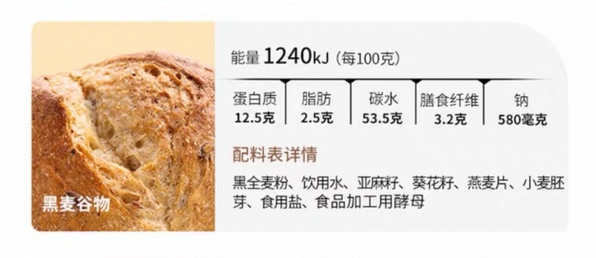 全麦面包一定要看配料表!大多只是小麦粉掺全麦粉,全麦粉含量很低。我是网上买的冻的,无需解冻,吃的时候从冷冻里拿出来,淋水后放入烤箱,15分钟即可。