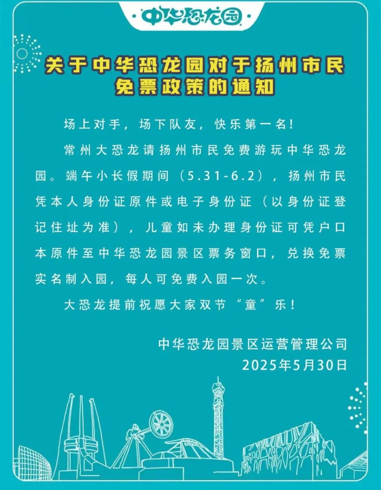 常州的中华恐龙园在“常州VS扬州”比赛前一天,拿出了对扬州市民的优惠政策,直接端午长假期间免费游玩。