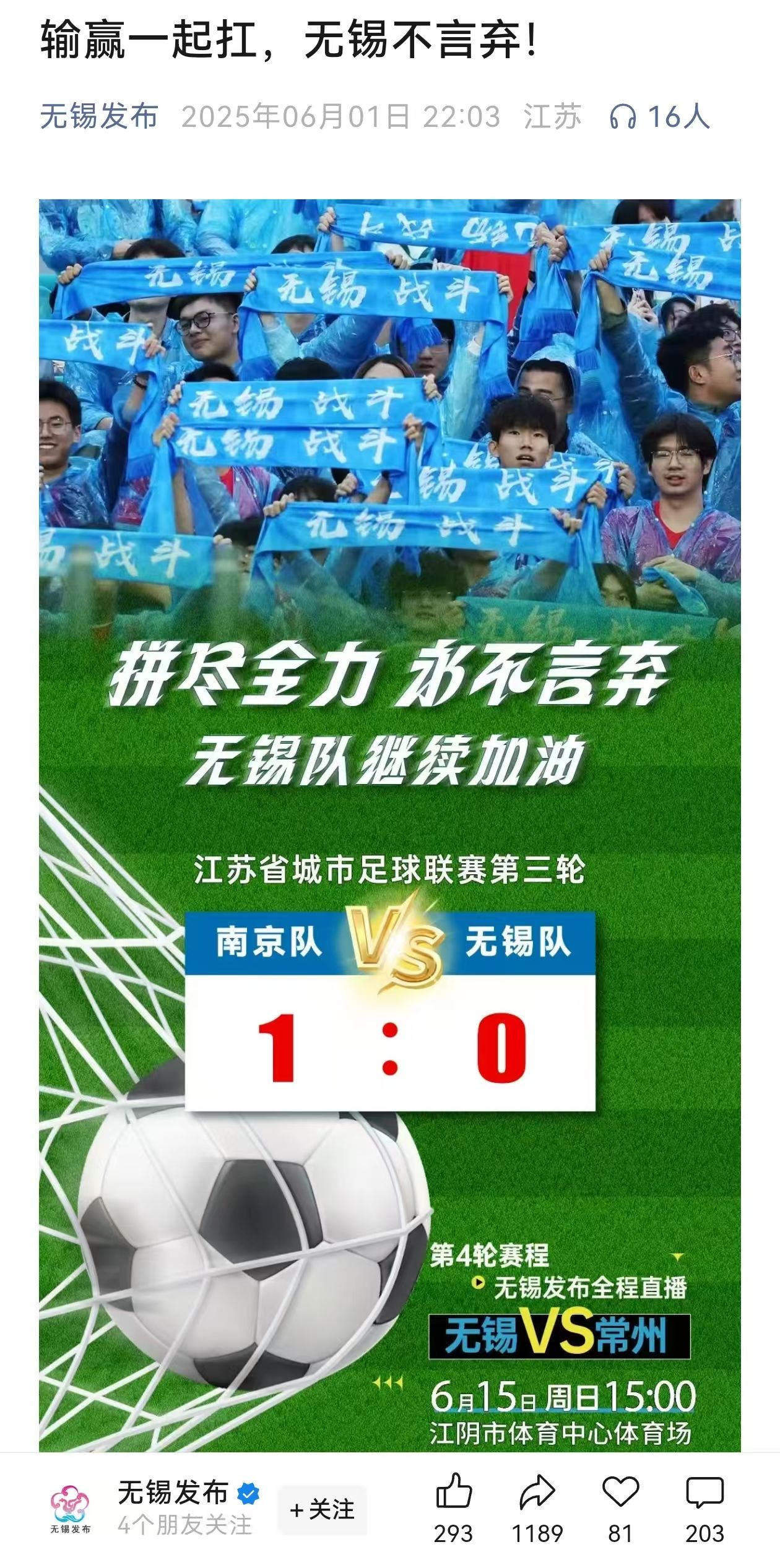 无锡输给南京后“无锡发布”刊出的海报,气氛真的很好