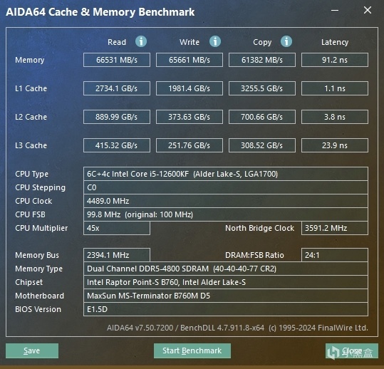 那麼來到金百達這款國產內存的套條測試,首先是默頻表現,其默認頻率並不是現在比較新的5600MHz,而是和較早版本D5內存條一樣的4800MHz,並且其時序給到了C40,所以其性能表現在默頻下就是十分的一般了,無論是延遲還是讀寫速度都很普通,在測試時我一度以爲又是三星顆粒一樣的純亮機條表現,但在XMP下,其實際表現則有着明顯翻盤。
