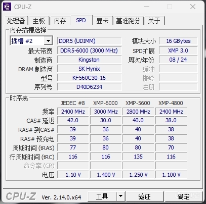 那麼首先是對照組的數據,我這邊用於對照的是採用了海力士a-die顆粒的金士頓6000C30,也就是傳說中的巨能超,在僅開啓XMP後其在上述配置下的數值表現如上圖所示,整體來說還可以,當然和很多大佬壓到C26之後的表現還是有些差別的,但超頻本身對於處理器以及主板都有所要求,所以本次只展示默頻以及XMP的表現,順帶一提,有些主板XMP都開不起來就有些頭疼了。