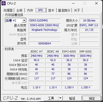 在開啓XMP之後,黑刃就跑在了6000C36的模式下了,其無論是延遲還是順序讀寫之類的參數都和金士頓的海力士A-Die顆粒表現差別不大,同時其穩定性上還是比較不錯的,相信用過銘瑄的都知道我在說啥(樂),順帶一提,CPU-Z上目前可能還未收錄長鑫顆粒的識別,所以這根內存在CPU-Z上會讀不出DRAM製造商,不過在對比編碼後可以確定,這款顆粒採用的是長鑫顆粒,所以也無需擔心了,畢竟長鑫顆粒本身的質量還是有目共睹的。