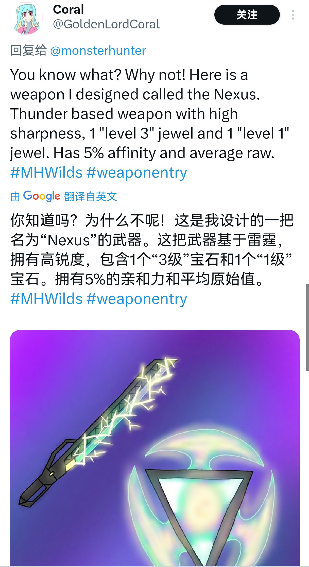活動將通過推特徵集獵人所使用的武器和飾物設計,優秀設計有機會被選中實裝到遊戲正式內容中