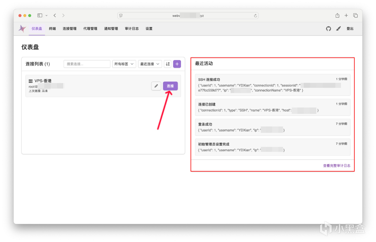然后点击顶部栏「仪表盘」,选择链接即可。可以看到旁边还有访问日志。
