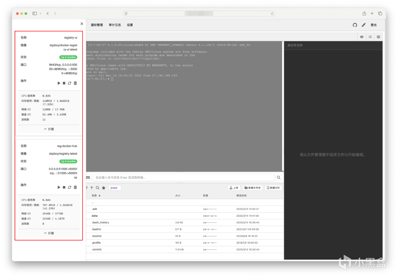 点击左侧那个Docker图标,还会显示出已安装的Docker容器。还可进行快捷操作,算是轻量的管理功能吧~其实这个VPS,就是我之前用来给大家提供免费Docker镜像地址的本尊😂。