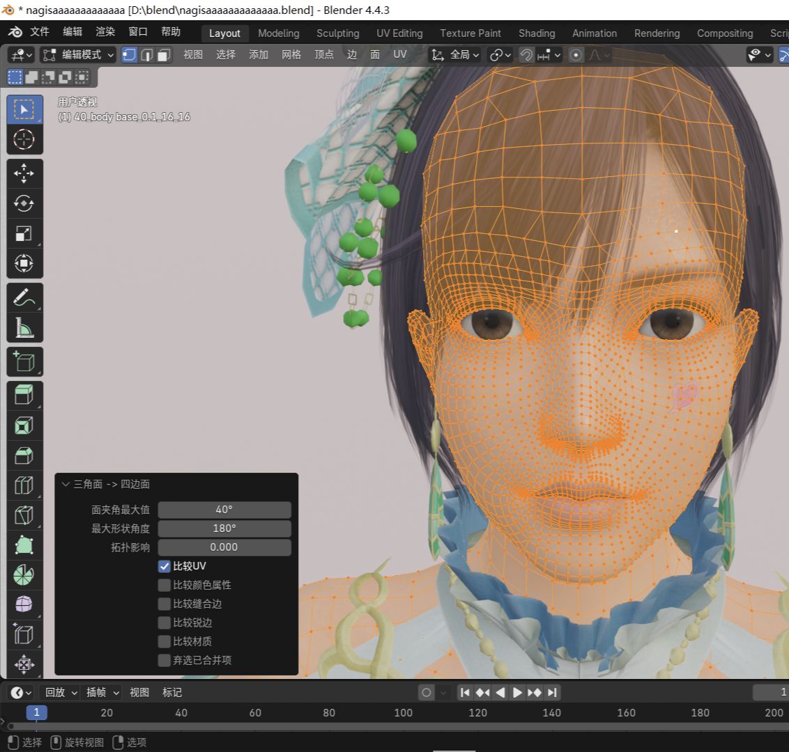 接着我們按alt+N選擇重置矢量。最後按alt+j進行三角面轉四邊面,左下角的最大形狀角度90度或180度都可以,一定要選擇比較UV,否則貼圖會出現錯誤。