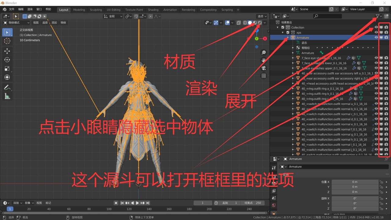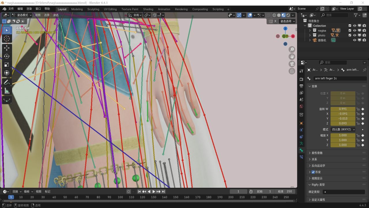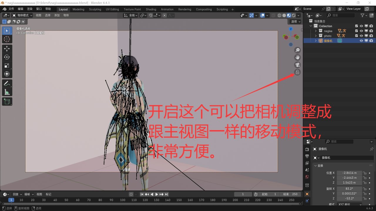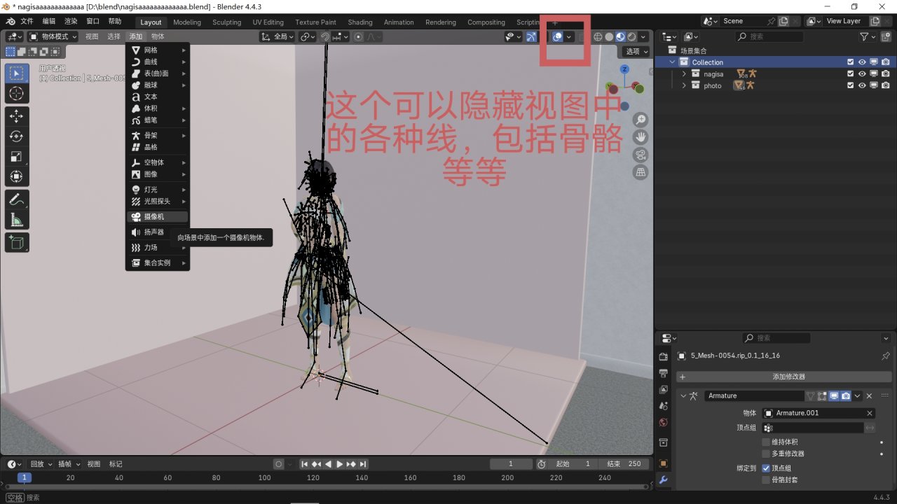 佈置好相機之後就就可以調整模型的一些細節了。比如某個部位穿模的問題,可以在姿態模式選擇那個骨骼進行調整,若找不到某個骨骼,可在右方骨骼列表展開尋找,也可在視圖顯示中取消勾選“在前面”。