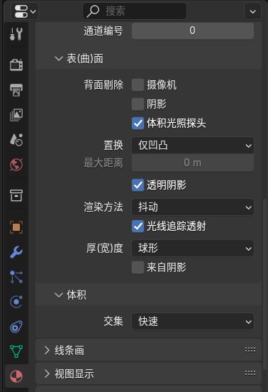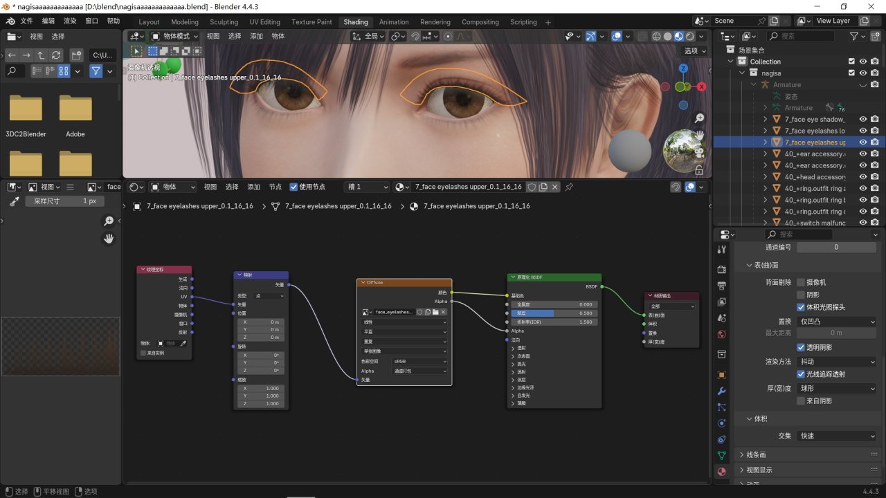 像睫毛、頭髮這種透明貼圖,一定要選擇抖動和透明陰影,不然在使用cycles渲染的時候會黑黑的一大片,透明陰影在材質屬性設置那一欄。