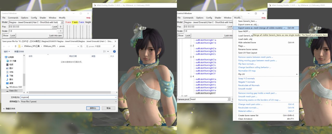 擺好姿勢就可以在文件裏選擇導出pose或者在修改中點擊作爲.mesh導出場景,要記住導出的位置,如果導出爲.mesh一定要新建一個文件夾。