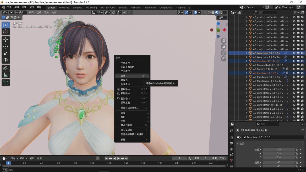 接下來的步驟目的是讓角色的身體儘量成爲一個整體,如果你找到的模型的頭身本來就是一個整體,就不需要做這一步。在視圖中點擊嘴脣,然後shift+左鍵點選頭部,再按shift+左鍵點選身體,選中這三個物體後,按ctrl+J或右鍵選擇合併。