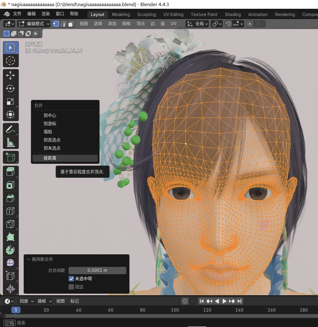 點擊合併之後的身體,選擇左上角的編輯模式,點擊身體上隨便一個點,按A鍵全選,接着按M選擇按距離合並,左下角的未選中項要打✓