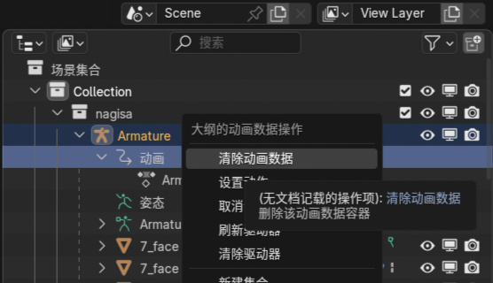 還有一件事,如果修改完角色姿勢之後,不小心點了空格播放,或保存後再打開此blend文件,某些部位又回到了初始位置,請右擊這個動畫數據把它清除掉,否則渲染出來也是初始狀態,原理我還沒搞明白。