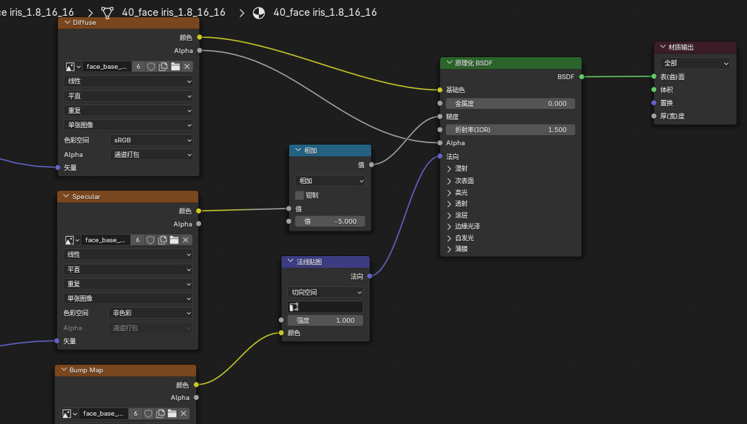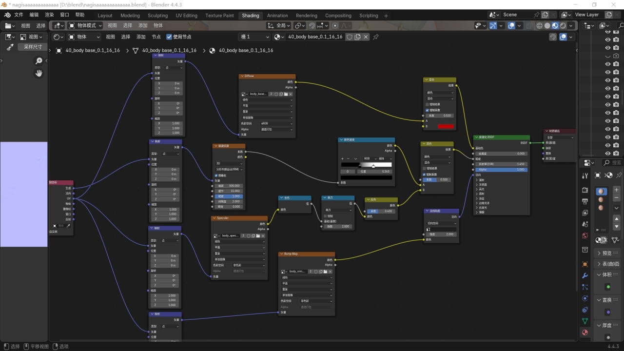 點擊身體或面部的材質,按照下圖,右鍵添加相應的節點,相比前面的有點多,但還算簡單,各種參數按照我的進行設置,但是不需要特別準確。注意圖中的混合是混合顏色。