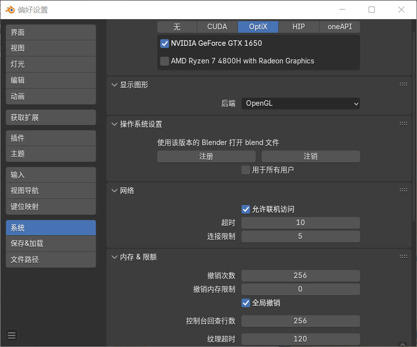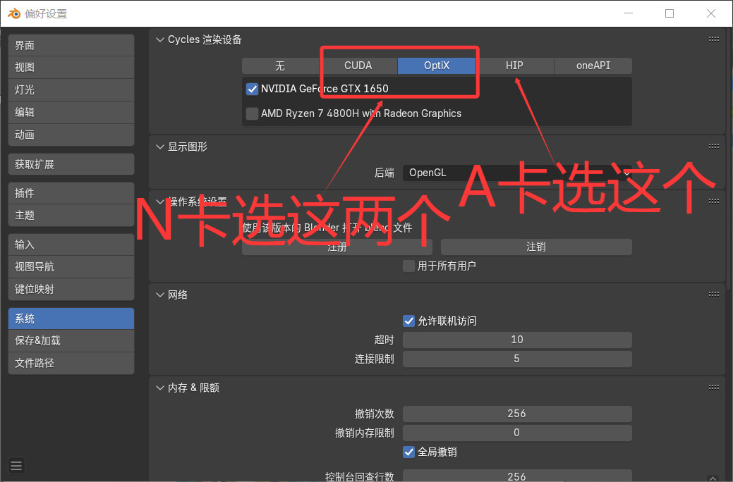 在系統中選擇cycles渲染設備,n卡選擇optix,a卡選擇hip,只勾選gpu即可。