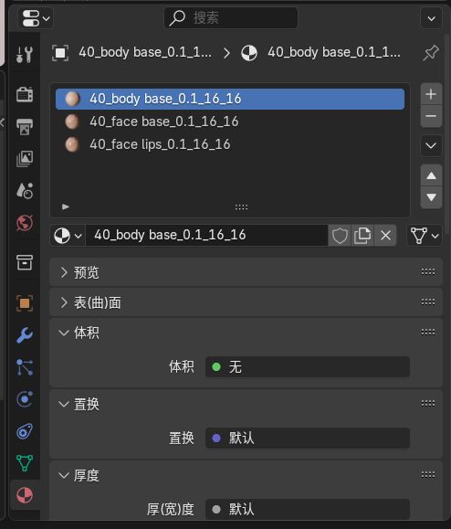 如果你想進一步提升皮膚質感,請繼續跟我做。我們點選角色的身體,在右側可以看到身體的所有材質,這是之前將這三個部分合並的緣故,我們需要對這三個材質分別進行編輯。