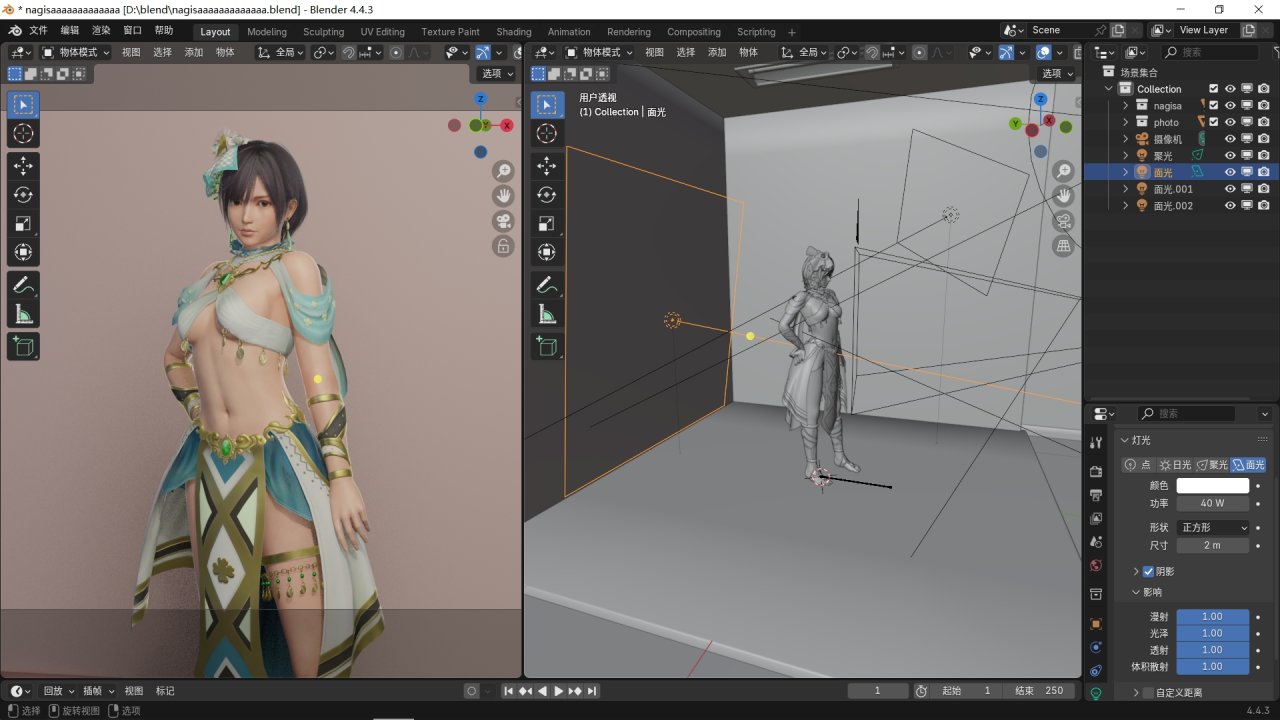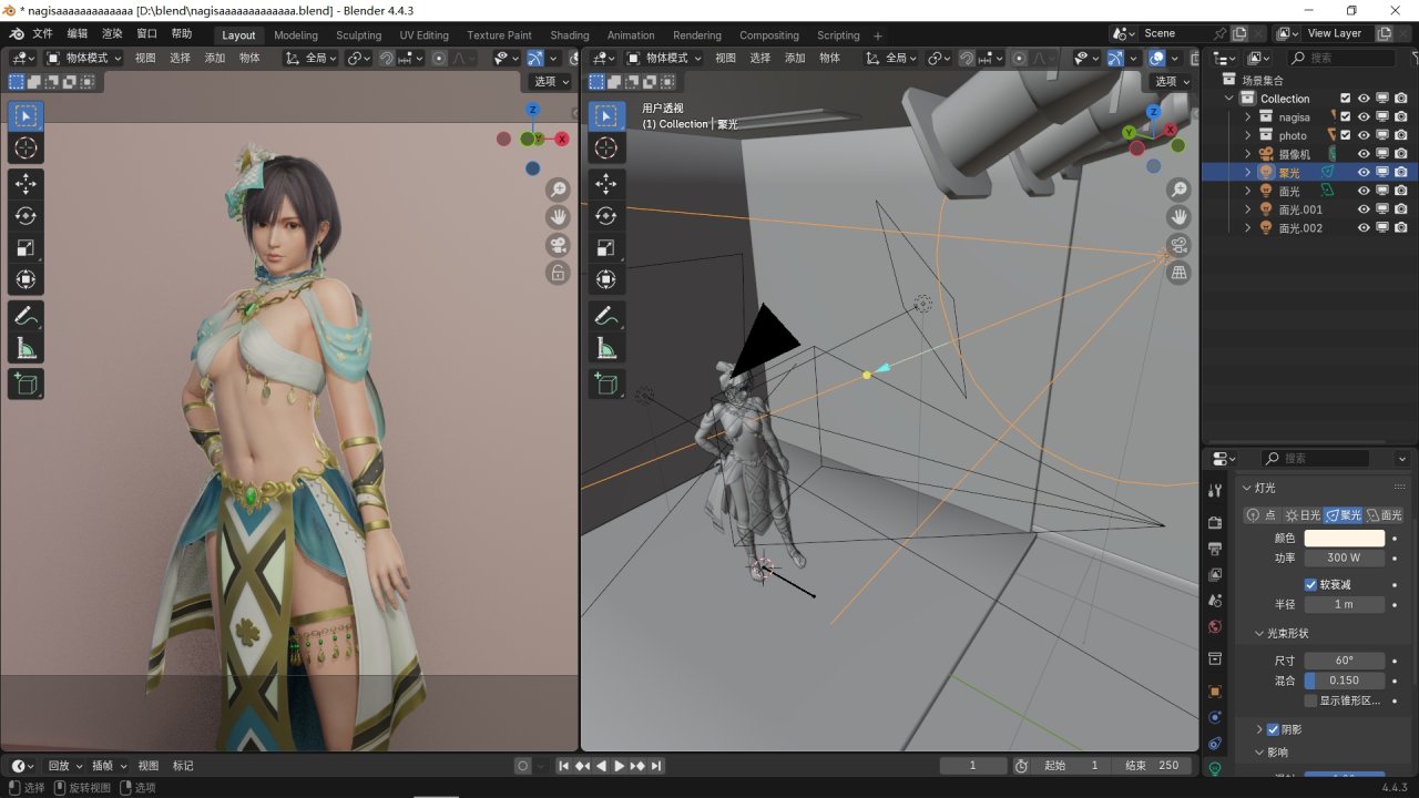 現在我左邊的渲染視圖用來預覽,右邊進行燈光的調整。現在向場景中添加燈光,我們選擇聚光或面光作爲主光源,位置最好在角色前的上下左右45°。