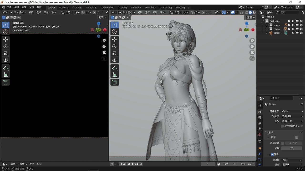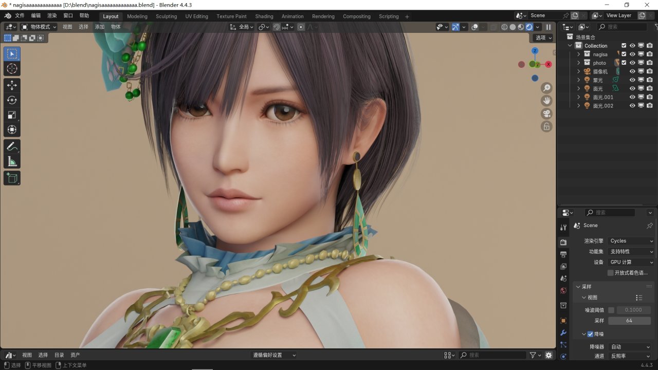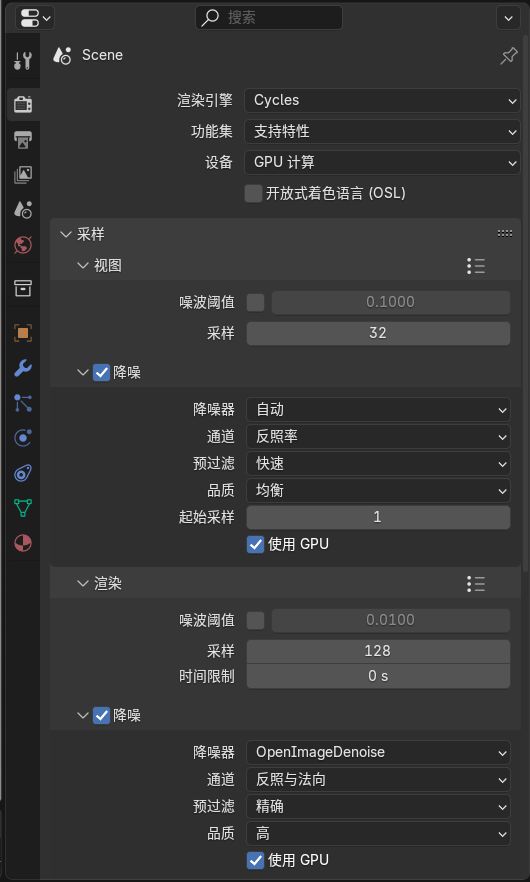 在右側渲染屬性選擇cycles或者eevee渲染引擎(cycles的渲染效果更好),設備選擇gpu計算,並打開下方設置中全部的降噪以及使用gpu選項。將視圖中的採樣改爲32,電腦配置較高可以調到64或以上。