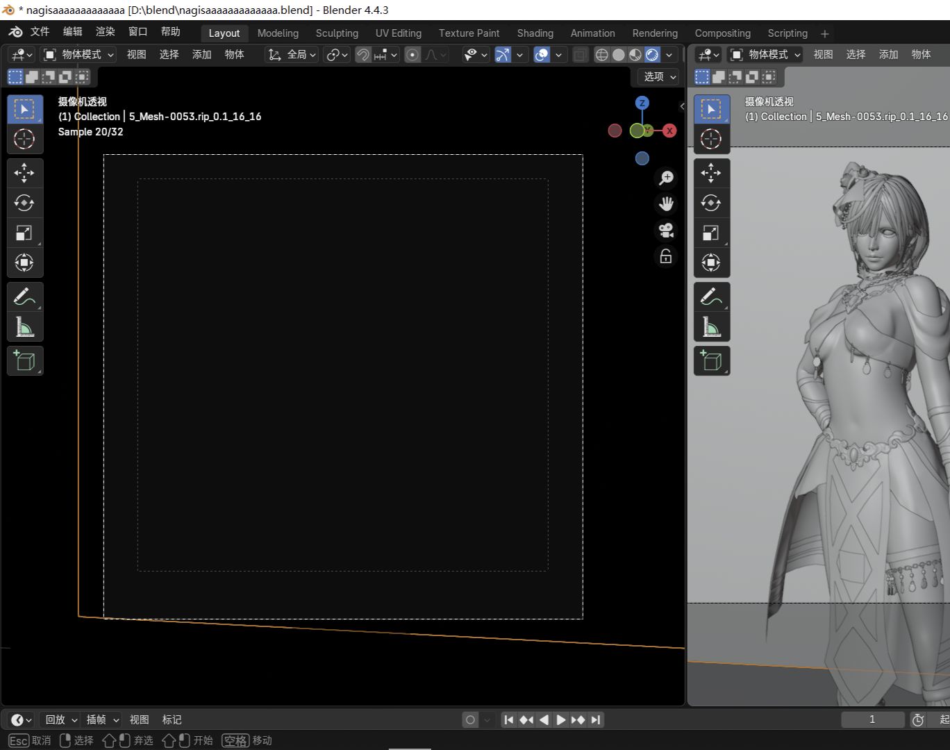 把左邊的視圖調到渲染預覽模式,上方四個圓圈點擊最右邊的圓圈,還可以把右側的視圖調成實體模式。因爲還沒有打光所以黑黑一片,進入攝像機視角,我們按ctrl+B,用鼠標左鍵畫方框把攝像機框起來。