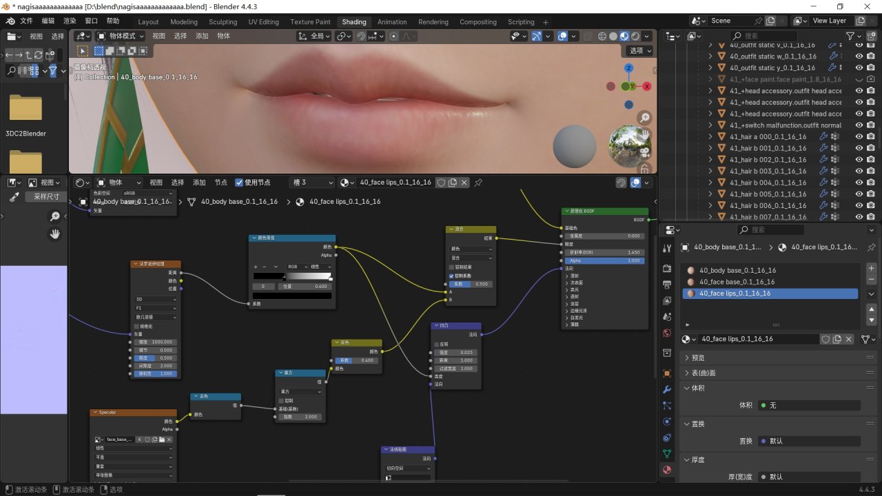 嘴部跟皮膚差不多,將噪波紋理改爲沃羅諾伊紋理,在法線貼圖後添加凹凸節點,各種參數要按照我的設置。