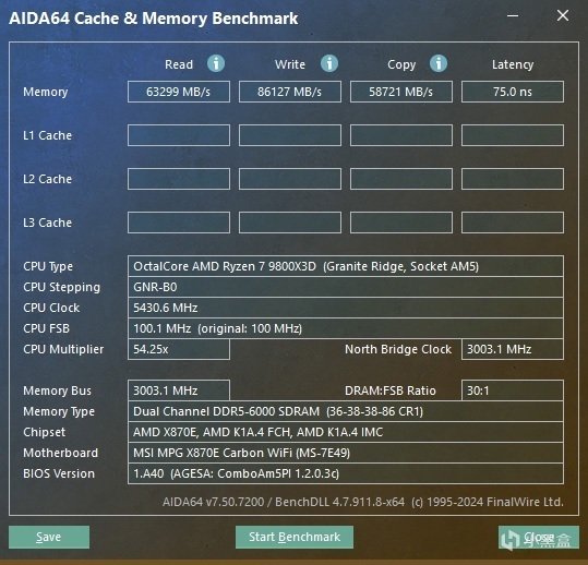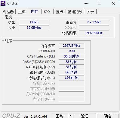 ▼內存默認開啓EXPO,頻率可以輕鬆穩定在6000MHz,時序36-38-38-124,9800X3D因爲其三級緩存容量很大,對內存性能並不敏感。