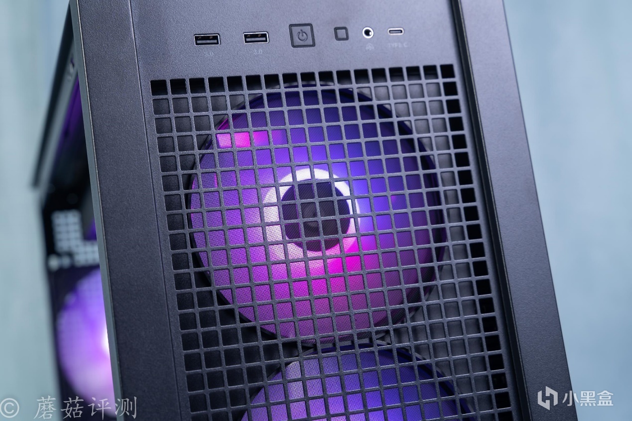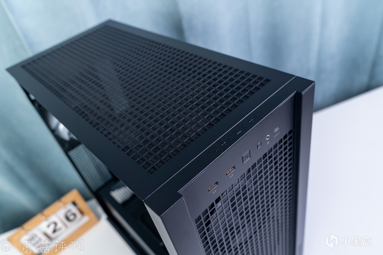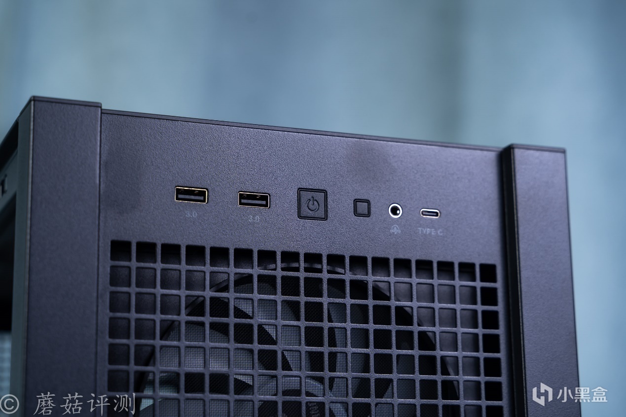 ▼機箱前部的頂部是機箱的IO面板,中間是開機和重啓鍵,左側有兩個USB 3.0接口,右側有一個3.5mm音頻接口和一個Type-C接口,帶寬最高支持到20Gbps。