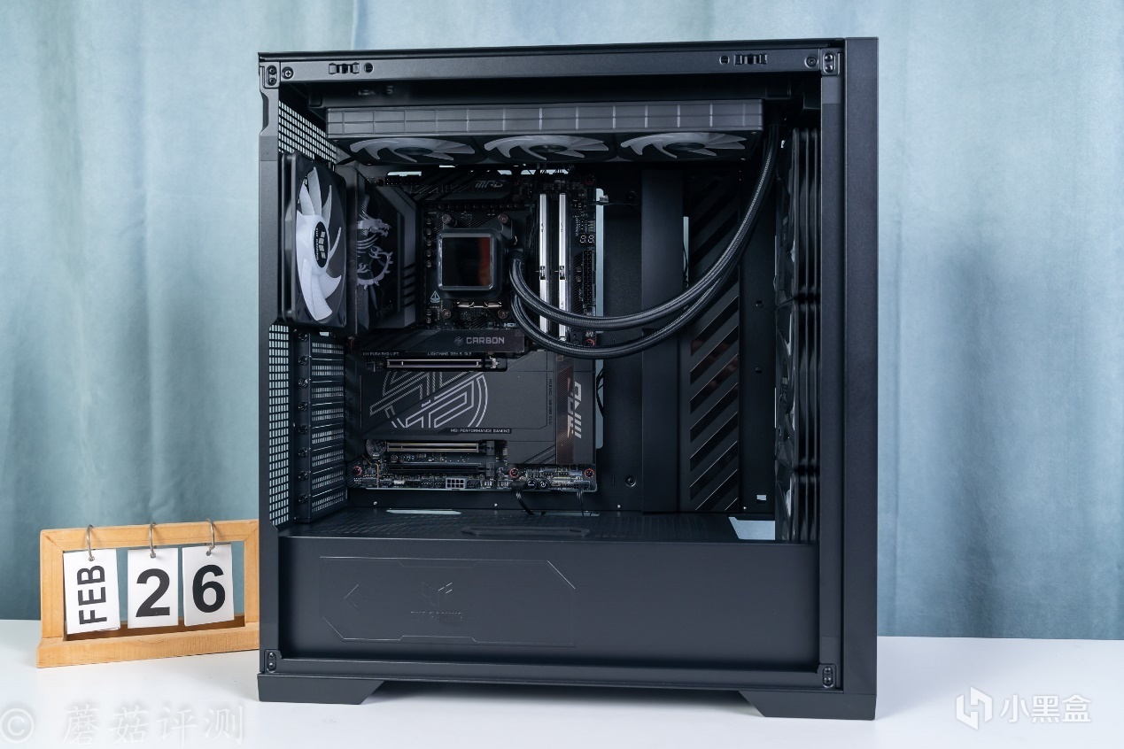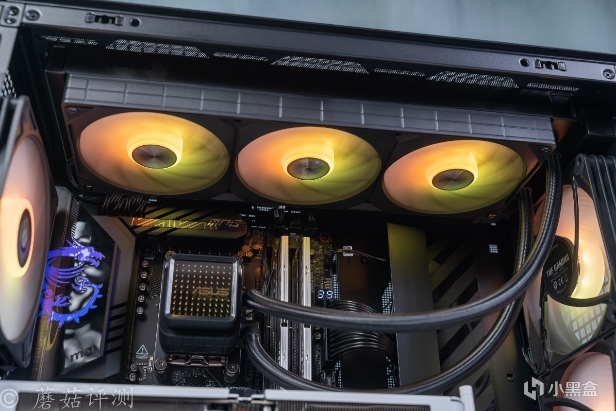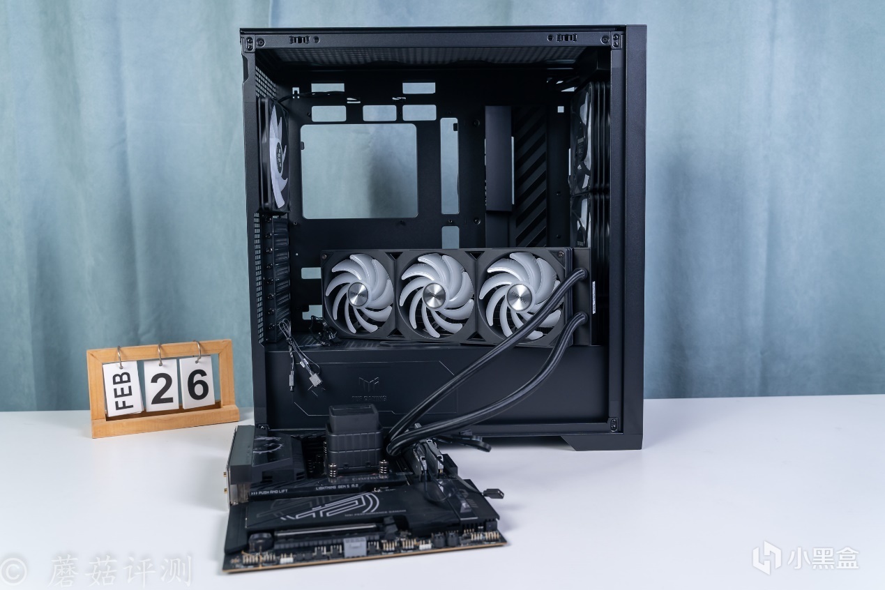 ▼主板輕鬆固定到主板位,水冷排安裝到機箱的頂部,機箱頂部的空間十分充足,水冷排的冷排風扇距離主板頂部還有不少的空間。