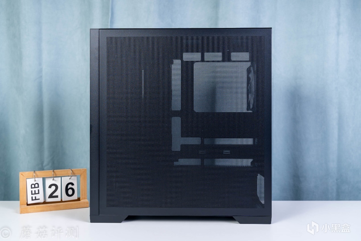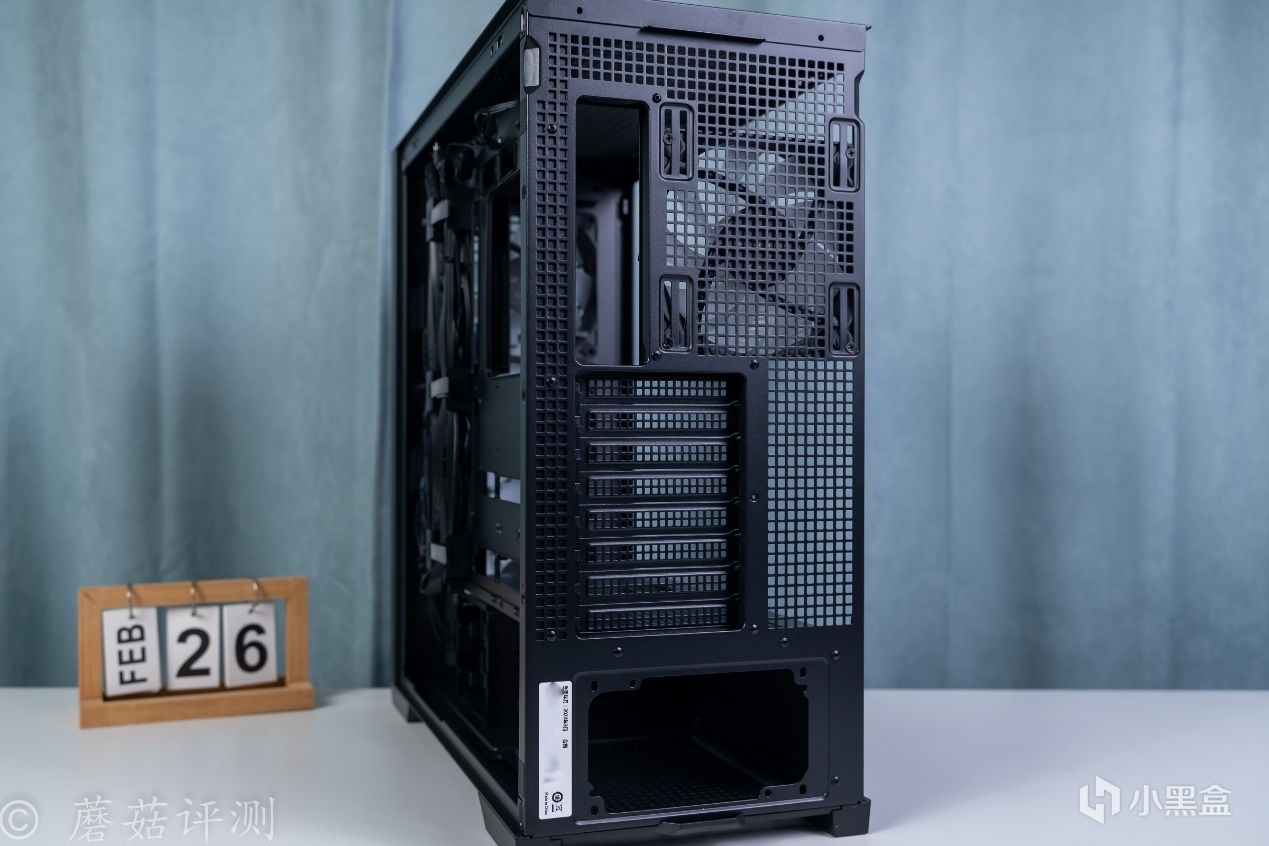 ▼機箱的背面,一整塊的金屬背板,中間是碩大的、密密麻麻的金屬衝孔網,散熱效果十分優秀。另外,這款機箱的兩側的蓋板支持互換,散熱、顏值可以隨意選擇。
