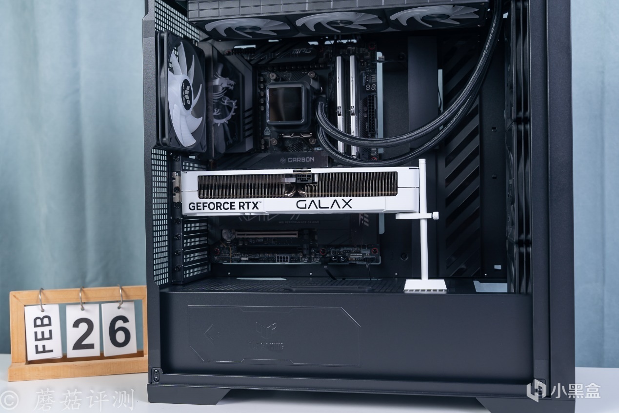 ▼顯卡水平安裝,並在顯卡的尾部撐一個原裝的顯卡支架,黑白配色的感覺也還不錯。