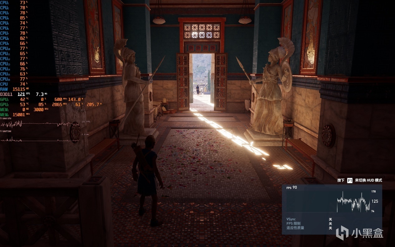 ▼遊戲實測,衆生平等奧德賽,2K分辨率,全極高畫質,體積雲最低,走廊遊戲幀數在121。