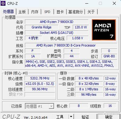 ▼簡單看下9800X3D的參數,8核心、16線程,三級緩存96MB,超大。