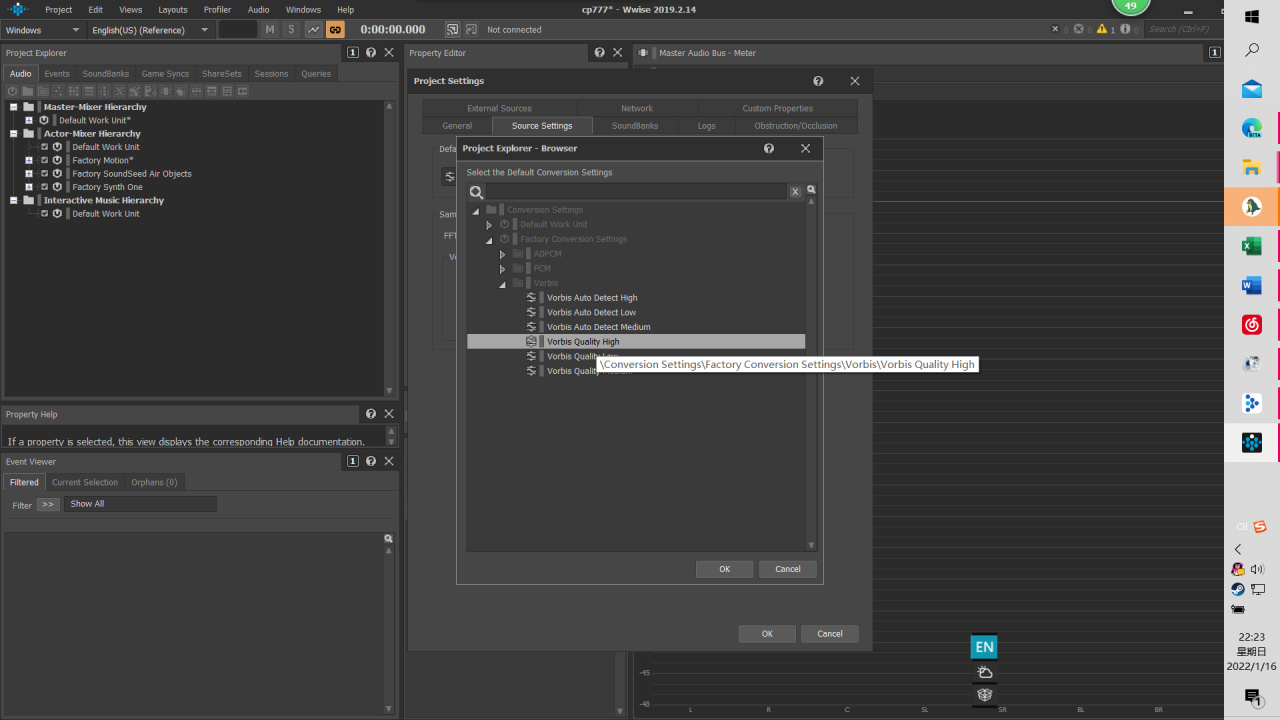 然後單擊“Project” ,在單擊“Project Settings” ,然後選擇“Source Settings” ,找到 “Default Conversion Settings”, 然後 “Factory Conversion Settings” ,然後“Vorbis” 選擇上 “Vorbis Quality High” 這一項,單擊 “OK”完成