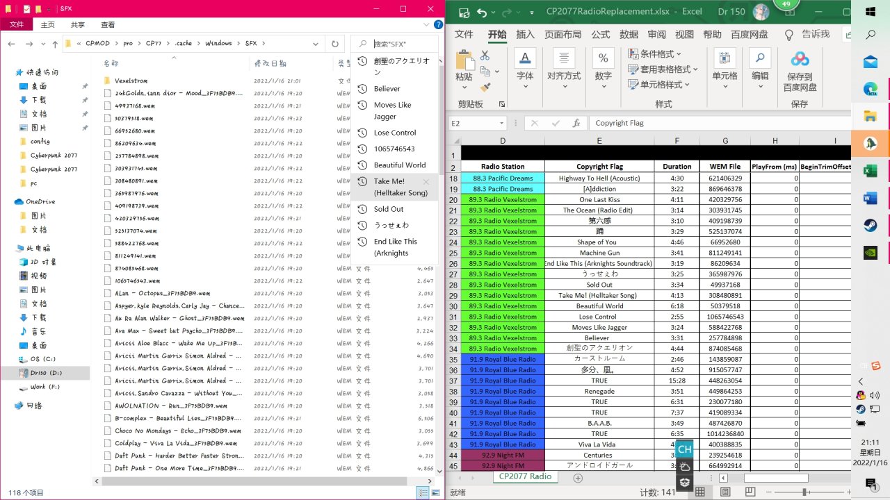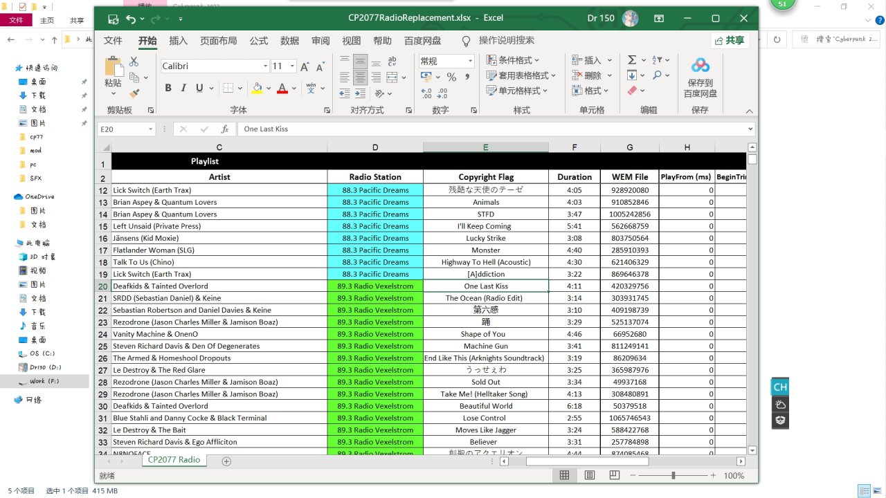 並對照時長(Duration) 找到合適的音樂,確保替換的音樂時長相同或者接近相同。因爲選曲時長如果超出了2077原電臺小段時長,超出部分會被直接切斷並播放下一段;如果短於原電臺小段時長,則缺少的時長電臺會靜默(相當於停止播放) 簡單來說如果原電臺5分鐘,用6分鐘音樂替換那最後一分鐘不播放直接到下一首,用4分鐘音樂播放完會停止一分鐘再播放下一首。選曲時長合適的話可以做到無縫播放(這一步驟略顯繁瑣,但目前未找到更快捷的做法)