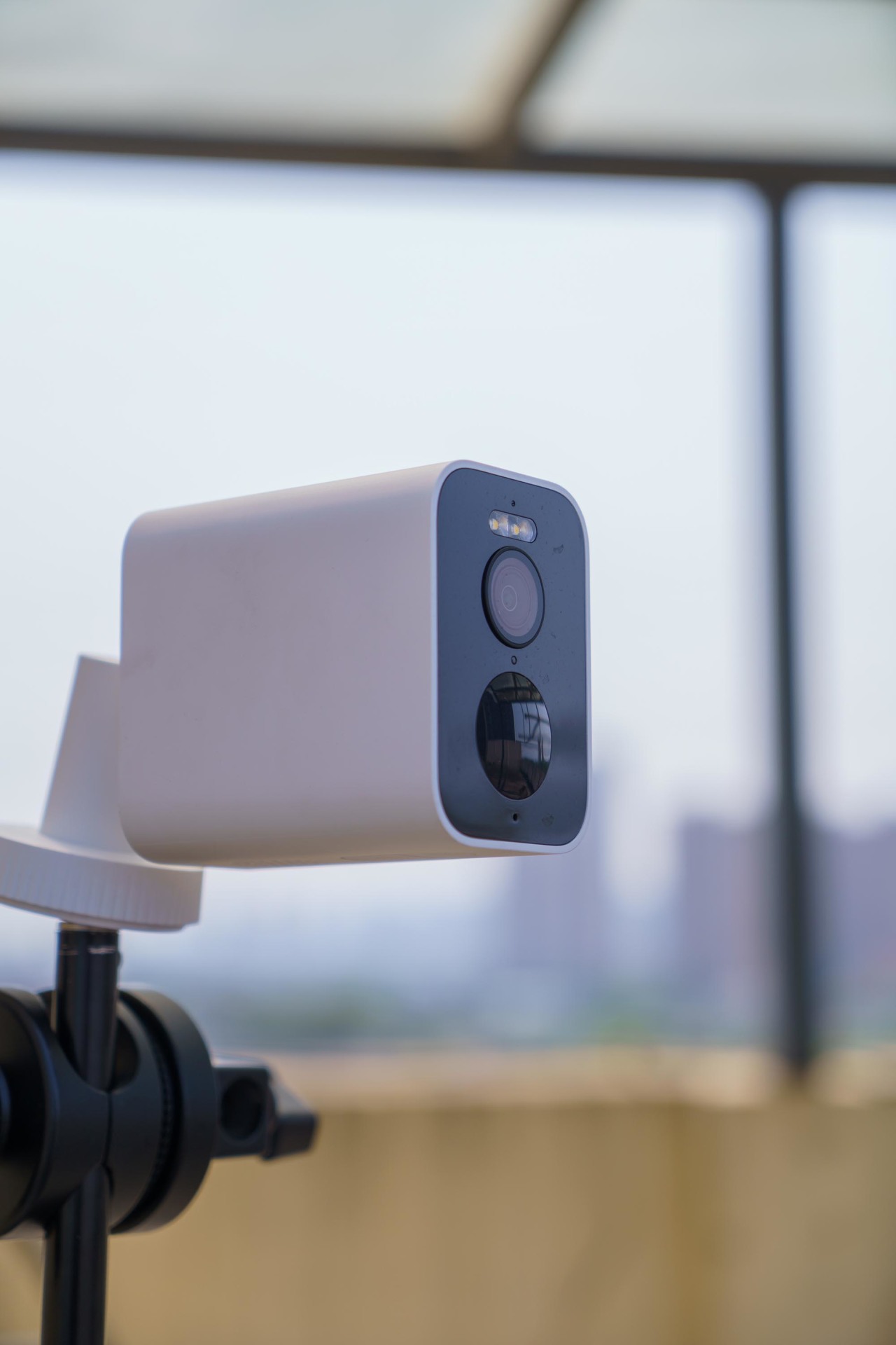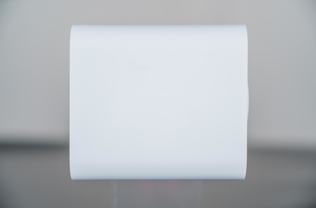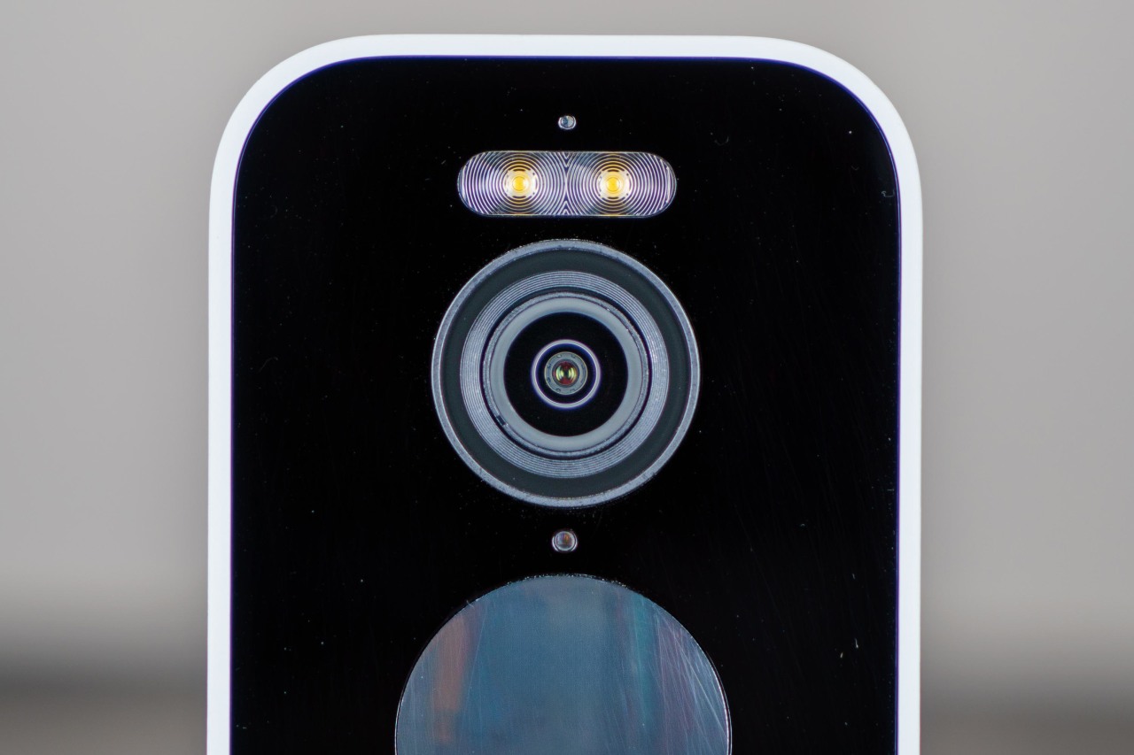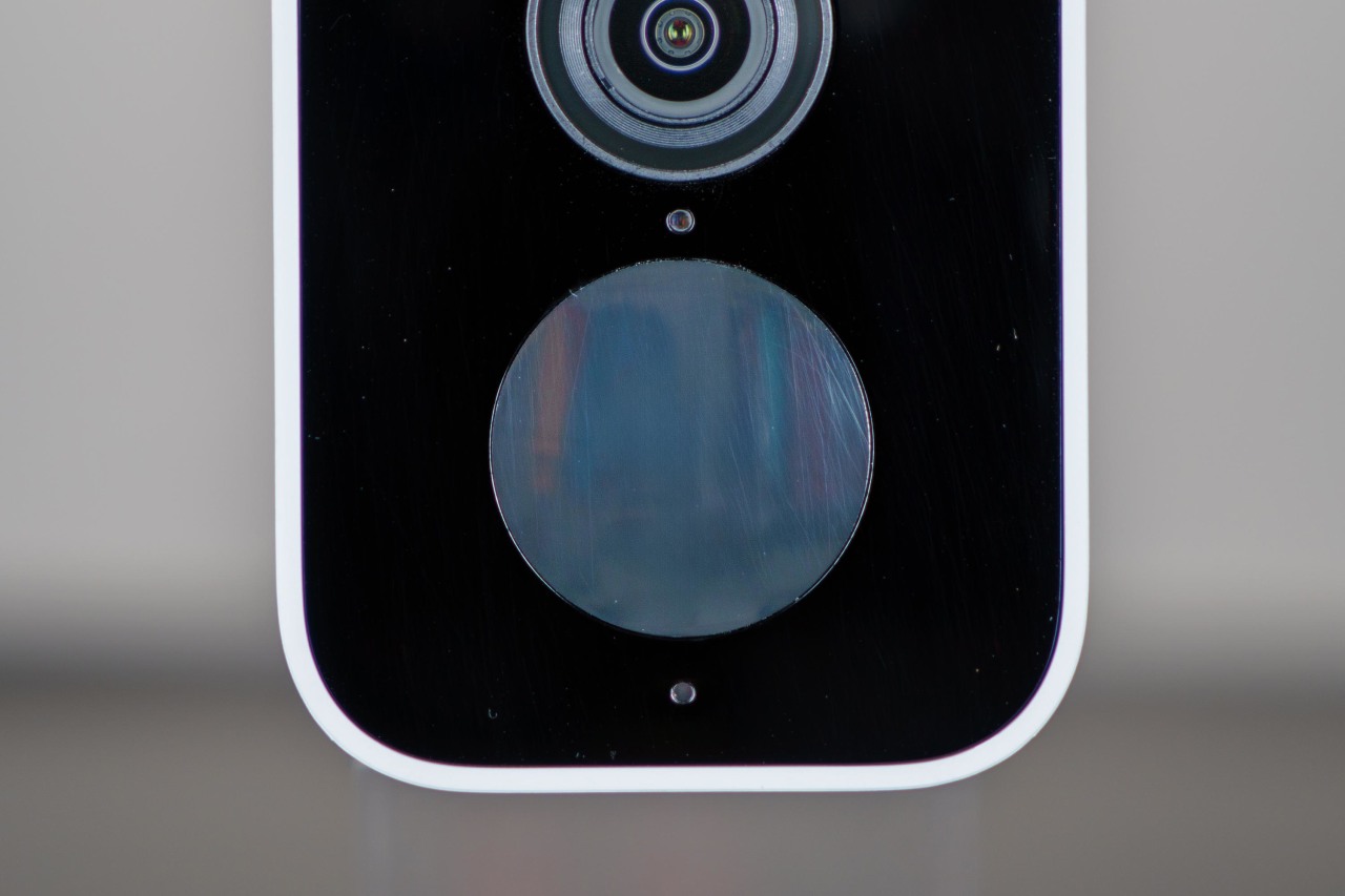 ▼正面顶部第一个是LED状态指示灯,第二个是两颗LED白光补光灯,第三个就是它的镜头,拥有136°超广角和F1.6的大光圈,配合它那颗1/2.7英寸、能够成像2.5K分辨率的图像传感器,可以在暗光环境提供非常不错的感光能力和画面清晰度,第四个是光敏传感器,可以感知环境光照强度以自动开启补光灯