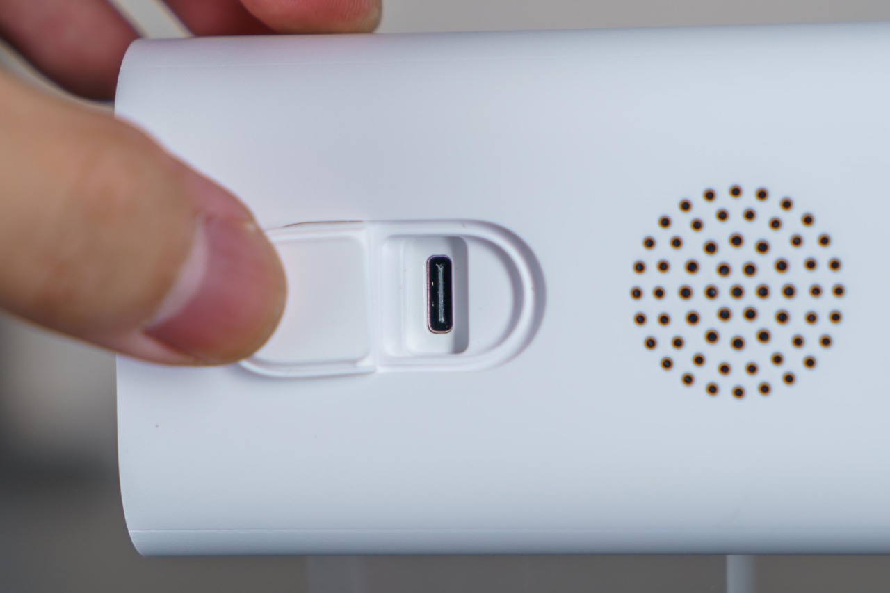 ▼电源按键设计在了底部,隔壁是充电接口,被橡胶防水盖盖着,有效避免接口进水,机器整体更是达到了IP67级的防尘防水等级,安装在露天户外,对恶劣天气毫不畏惧;最右侧是外放扬声器开孔,顶部则是光的