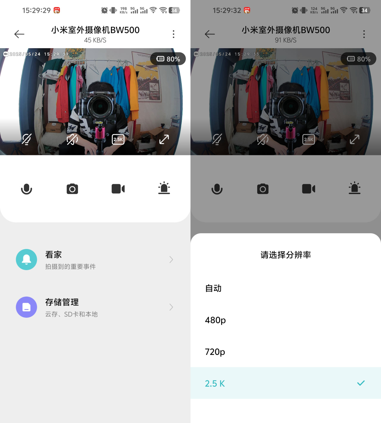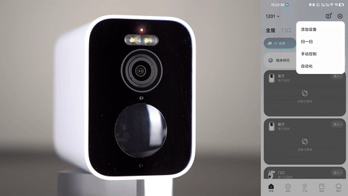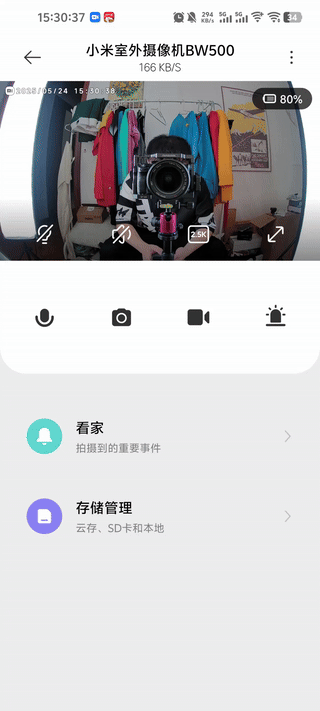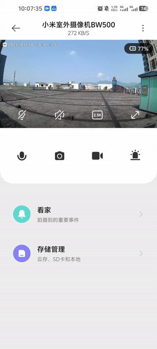 ▼添加成功后,设备主页就是长这样,这个界面看过我前面关于米家生态安防产品的朋友,应该非常熟悉了;画面上四个图标功能分别为:白光灯开关、外放开关、预览画面分辨率切换、全屏